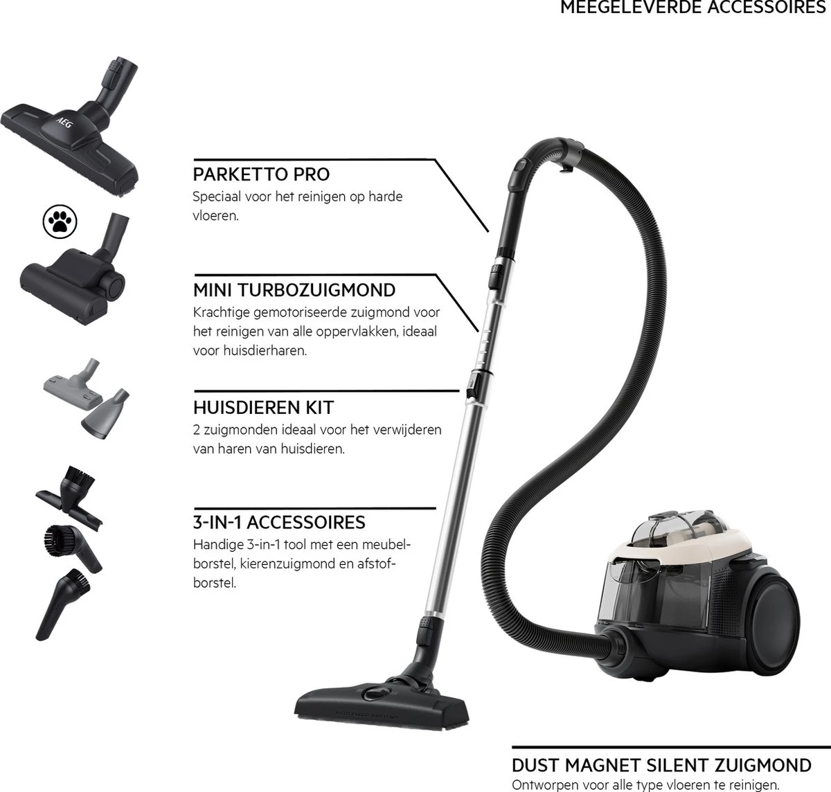 De AEG Animal 6000 zakloze stofzuiger is ergonomisch vormgegeven en staat garant voor krachtige prestaties. De Animal 6000 wordt geleverd met een speciale kit voor het verwijderen van haren van huisdieren uit zowel bekleding als uit gestoffeerde meubels. Dankzij de geavanceerde cycloontechnologie levert de Animal 6000 grondige schoonmaakresultaten, dit terwijl het stofreservoir zich vult. De cycloontechnologie zorgt ervoor dat de prestaties behouden blijven ongeacht het gevulde stofreservoir.