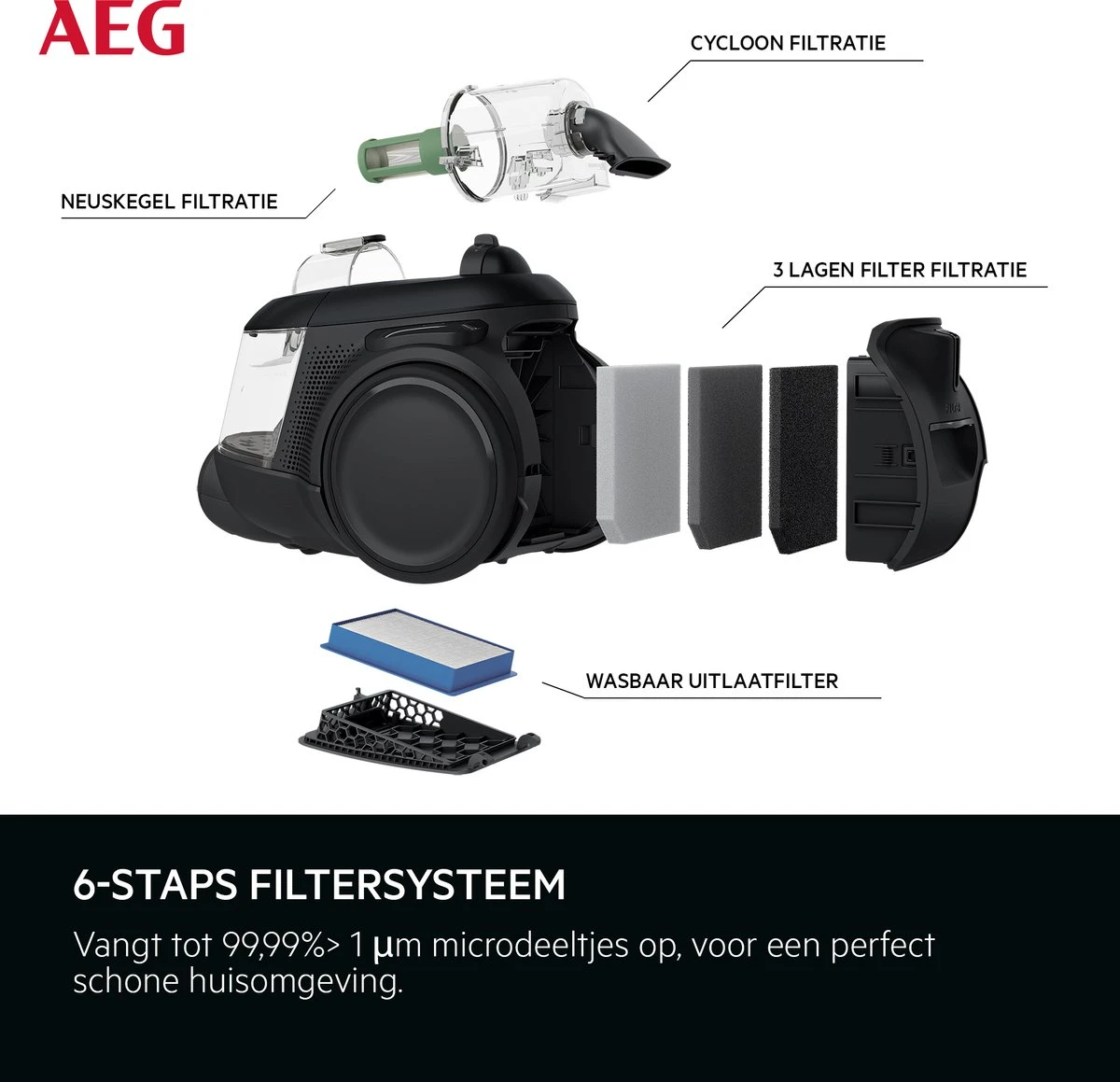 Het Hepa 13 luchtfilteringsysteem bestaat uit zes stappen. Hierdoor wordt er tot wel 99,99% van de microstofdeeltjes opgenomen voor een schonere uitstootlucht. Daarnaast is het leegmaken van het stofreservoir ontzettend makkelijk en in slechtst 2 stappen te doen. Voor het gebruiksgemak is het reservoir zodanig ontworpen dat dit in een soepele beweging volledig hygïenisch geleegd kan worden. Vervolgens plaats je het reservoir weer net zo makkelijk terug.