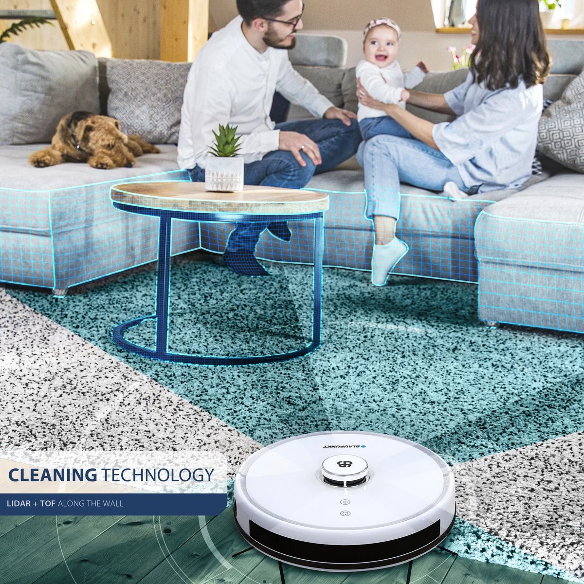 Met een gewicht van 3,35 kg beweegt deze probleemloos over verschillende vloeren, zoals harde vloeren, houten vloeren en zelfs laagpolig tapijt. Deze ondergronden zijn met een zuigkracht van 4 verschillende levels dan ook geen enkel probleem. De Bluebot maakt gebruikt van lasertechnologie om zichzelf te sturen. Dit brengt een aantal voordelen met zich mee: