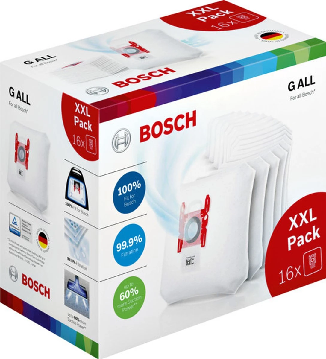 Deze Bosch BBZ16GALL is een power protect stofzak geschikt voor alle G-types Bosch en Siemens stofzuigers met stofzak. in de verpakking bevatten 16 stuks. Door 4 lagen materiaal zorgen deze Bosch BBZ16GALL stofzuigerzakken ervoor dat het stof beter gefilterd wordt.