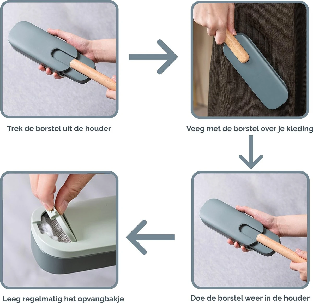 De huisdierhaar verwijderaar is zeer eenvoudig te gebruiken. Houd met je ene hand de behuizing vast en trek daarna met je andere hand de borstel naar buiten (dit hoort enigszins wat moeilijk te gaan). Veeg vervolgens met de borstel over je kleding (of ander oppervlak gemaakt van stof) tot de haren zijn verdwenen. Als je klaar bent schuif je de borstel weer in de behuizing. Haal een in de zoveel tijd het klepje open van de behuizing en verwijder de verzamelde haren en stofdeeltjes uit het opvangbakje.