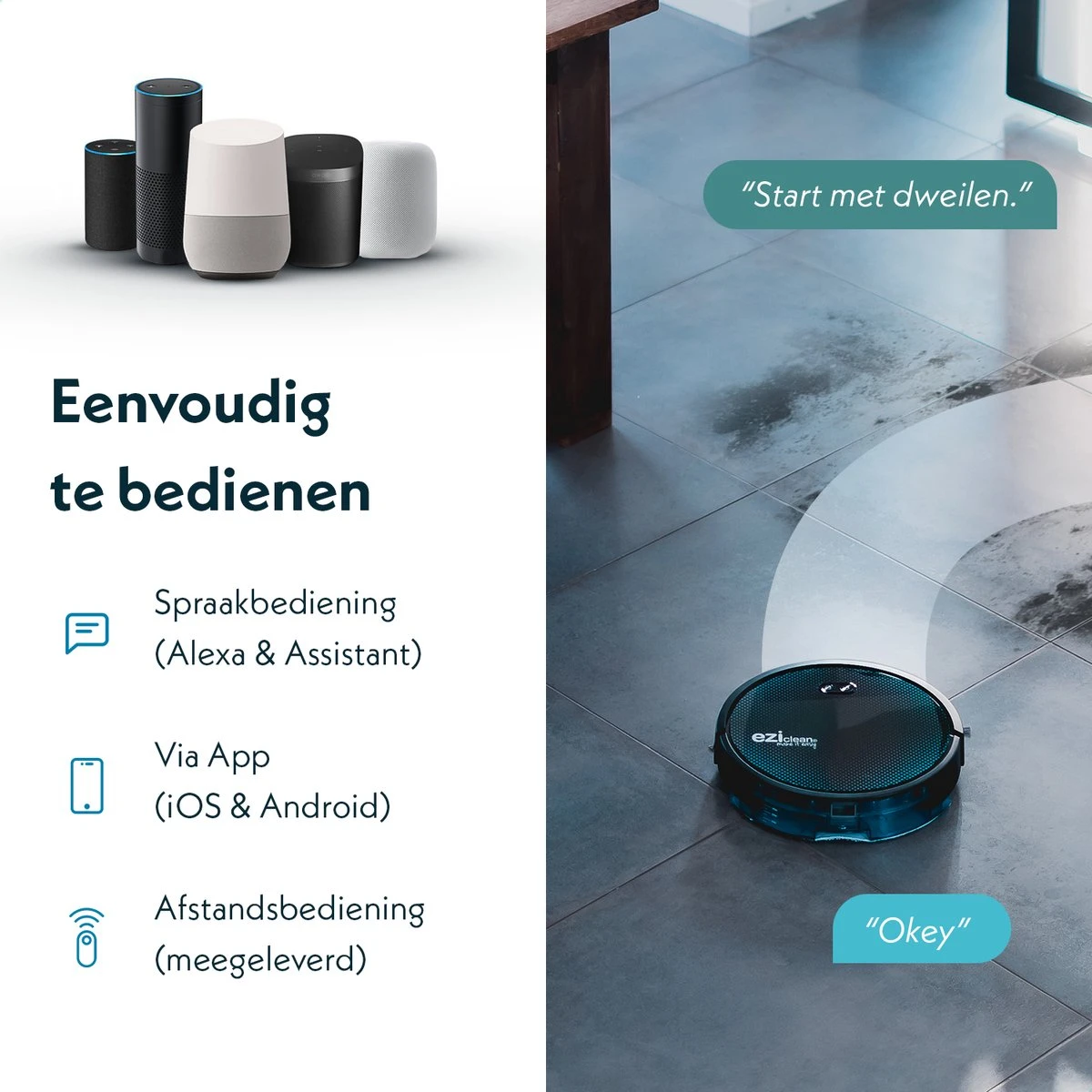 De Eziclean® Aqua-Connect x550 is gemakkelijk te bedienen via de Eziclean®-app, hierdoor start je gemakkelijk het opruimen van je huis waar je ook bent. Je kunt de stofzuiger gemakkelijk bijhouden, zo zie je waar de stofzuiger al is geweest en wat het resterende batterij percentage is, ook kun je de zuigkracht aanpassen. De Eziclean® Aqua-Connect x550 kan ook verbonden worden met Google Assistent en Alexa zodat je de stofzuiger ook met spraakbediening kunt besturen.