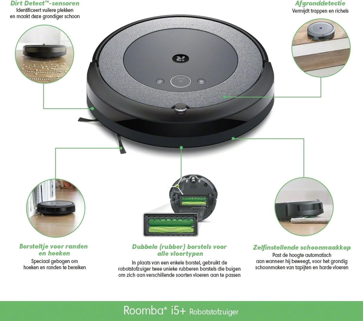 Denk niet meer aan schoonmaken met de Roomba i5-robotstofzuiger. Reactieve sensortechnologie helpt voorkomen dat hij vast komt te zitten en de Dirt Detect sensoren helpen bij het bepalen van de plek waar schoonmaken het hardst nodig is.