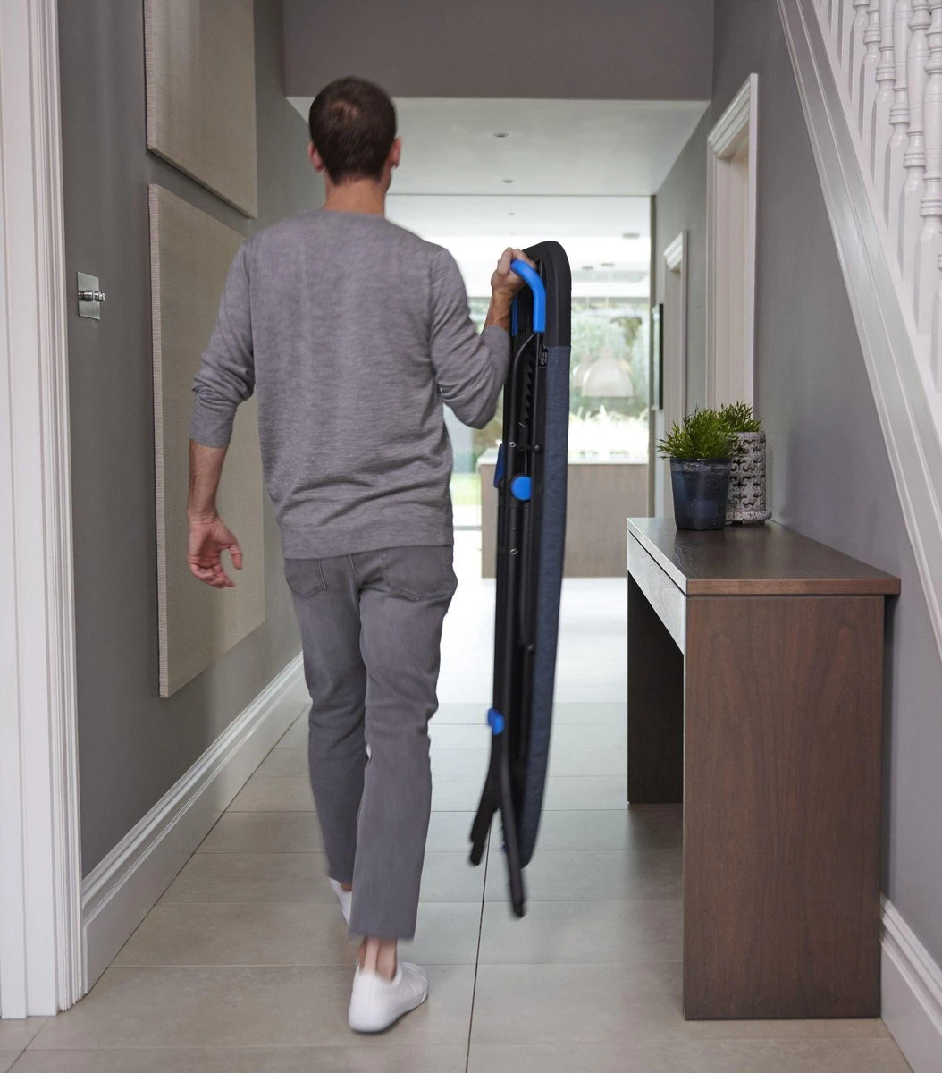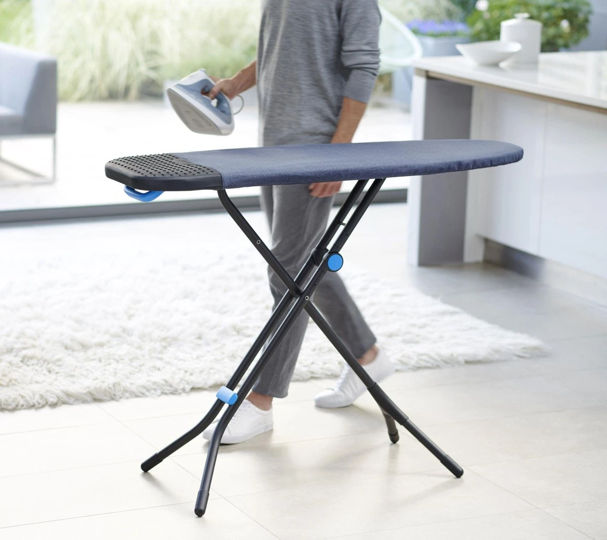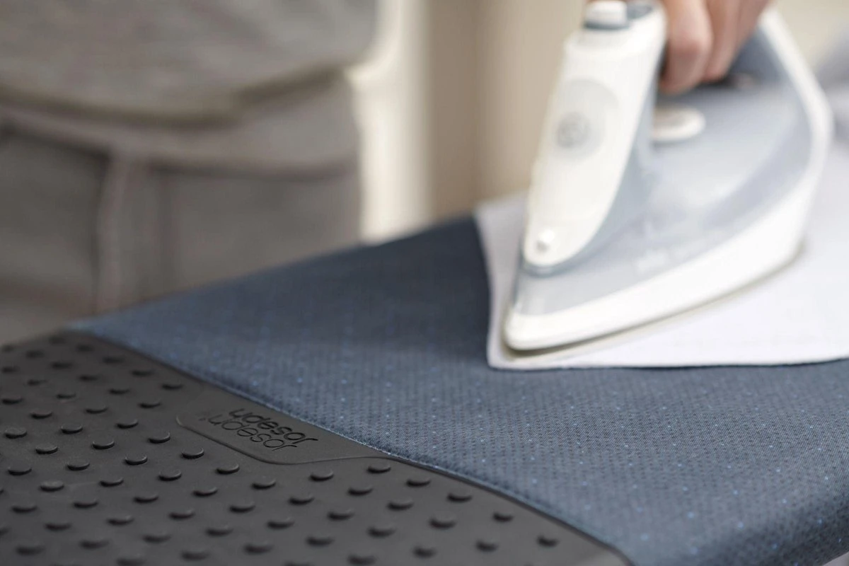 Traditionele strijkplanken kunnen erg onhandig zijn in huis. De poten blijven makkelijk achter de deurpost haken en het neerzetten van een strijkplank is soms lastig en luidruchtig. De Glide strijkplank heeft een volwaardig formaat, een revolutionair design en is compacter dan traditionele strijkplanken. Het innovatieve mechanisme van de poten zorgen ervoor dat hij extra makkelijk in -en uit te klappen is. De poten zijn verstelbaar in 7 verschillende standen met een hendel van 84 t/m 99 cm. Daarnaast vind je aan de achterzijde een handgreep waardoor hij makkelijker verplaatsbaar is. Deze handgreep is tegelijkertijd het hulpstuk waarmee je hem aan de bijgeleverde haak kunt ophangen aan de binnenzijde van een deur. De hoes is gemaakt van een geavanceerde meerlagige ‘DripShield’ technologie die speciaal is ontworpen voor grote strijkvolumes of voor het gebruik van stoom. De hoes kan daarnaast ook gemakkelijk verwijderd worden.