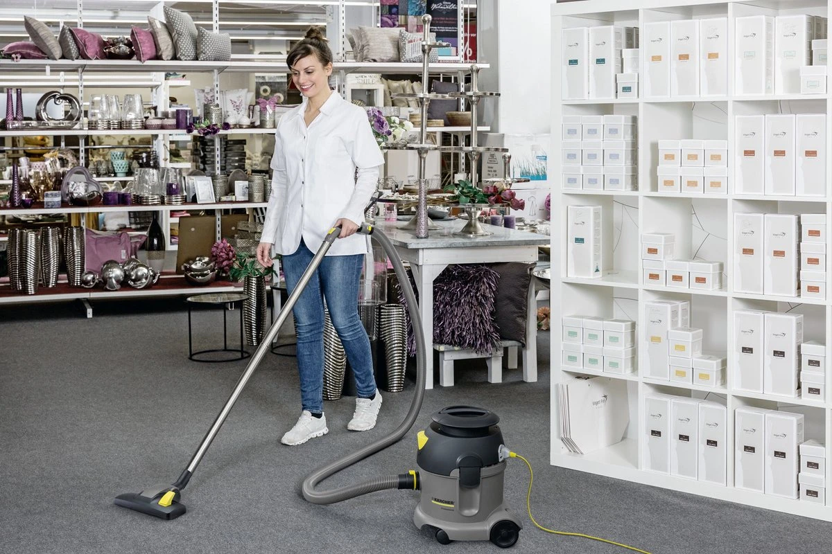 Onze droogzuiger T 10/1 Adv HEPA met een containerinhoud van 10 liter verrast zelfs ervaren professionals met maximale zuigkracht en tegelijkertijd extreem laag geluidsniveau. De stofzuiger genereert een indrukwekkende vacuüm van 22 kPA uit 700 watt vermogen en garandeert de beste reinigingsresultaten bij gebruik in kantoren, in winkels, in horeca of in zorginstellingen. Met slechts 57 dB(A) is hij zo stil dat hij ook ’s nachts probleemloos in ziekenhuizen of hotels kan worden gebruikt, waardoor hij ideaal is voor professionele gebouwenreinigers. Het geïntegreerde HEPA-14-filter is gecertificeerd volgens de testnorm DIN EN 1822:2019 en houdt met een scheidingsgraad van 99,995% zelfs de kleinste deeltjes in het bereik van enkele micrometers vast. Zelfs aërosolen, virussen en ziektekiemen worden bijna volledig onderschept, zodat de hoogste veiligheidsnormen worden gegarandeerd in hygiënisch gevoelige ruimtes. Compact, niet kantelbaar, robuust, onderhoudsvriendelijk en ontworpen met een ergonomische elleboog, de T 10/1 Adv HEPA scoort ook met comfortabele bediening via voetschakelaar, kabelhouder en kabelhaak, stabiele parkeerpositie voor het vloermondstuk en de meegeleverde vlies filterzak.
