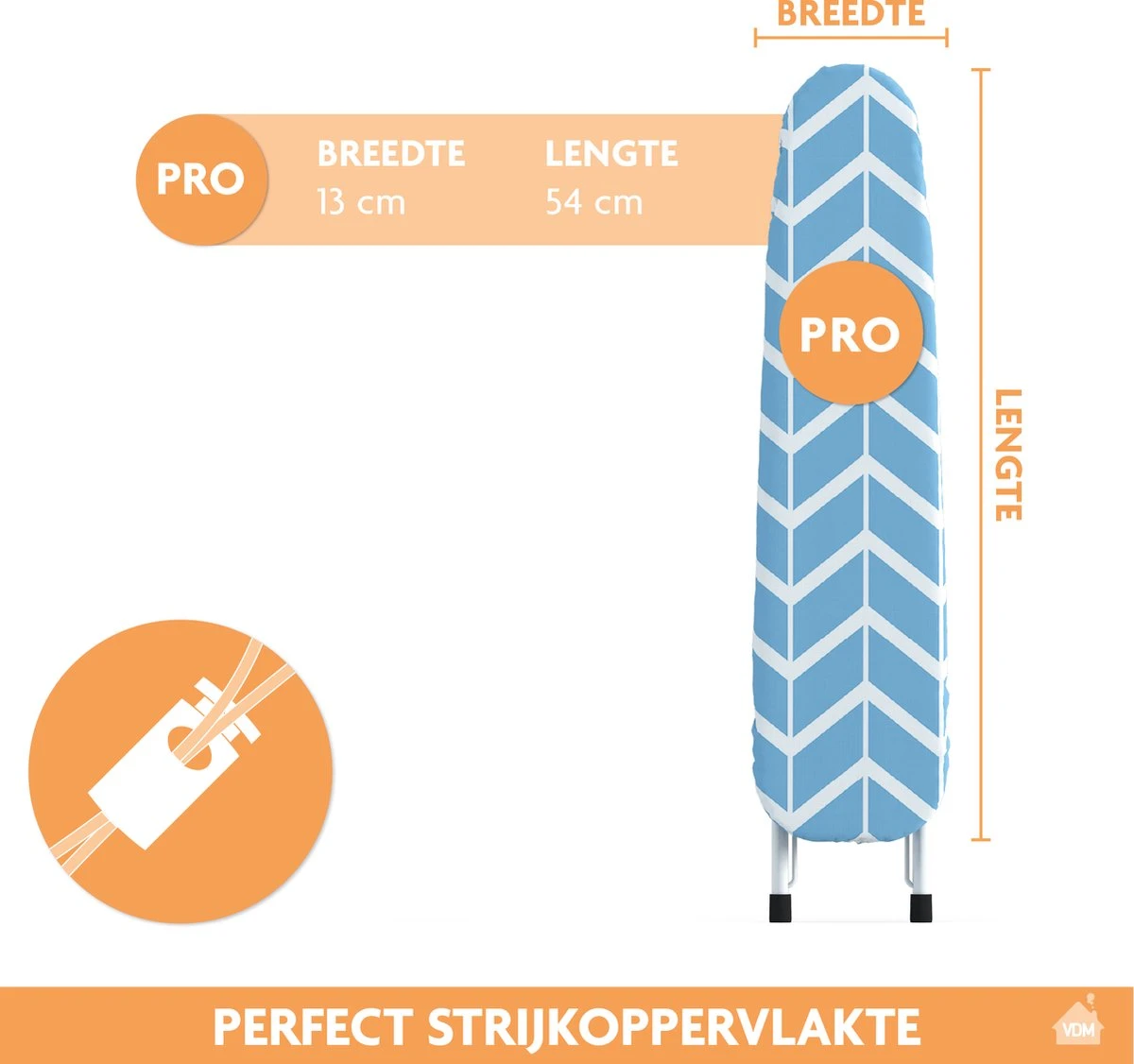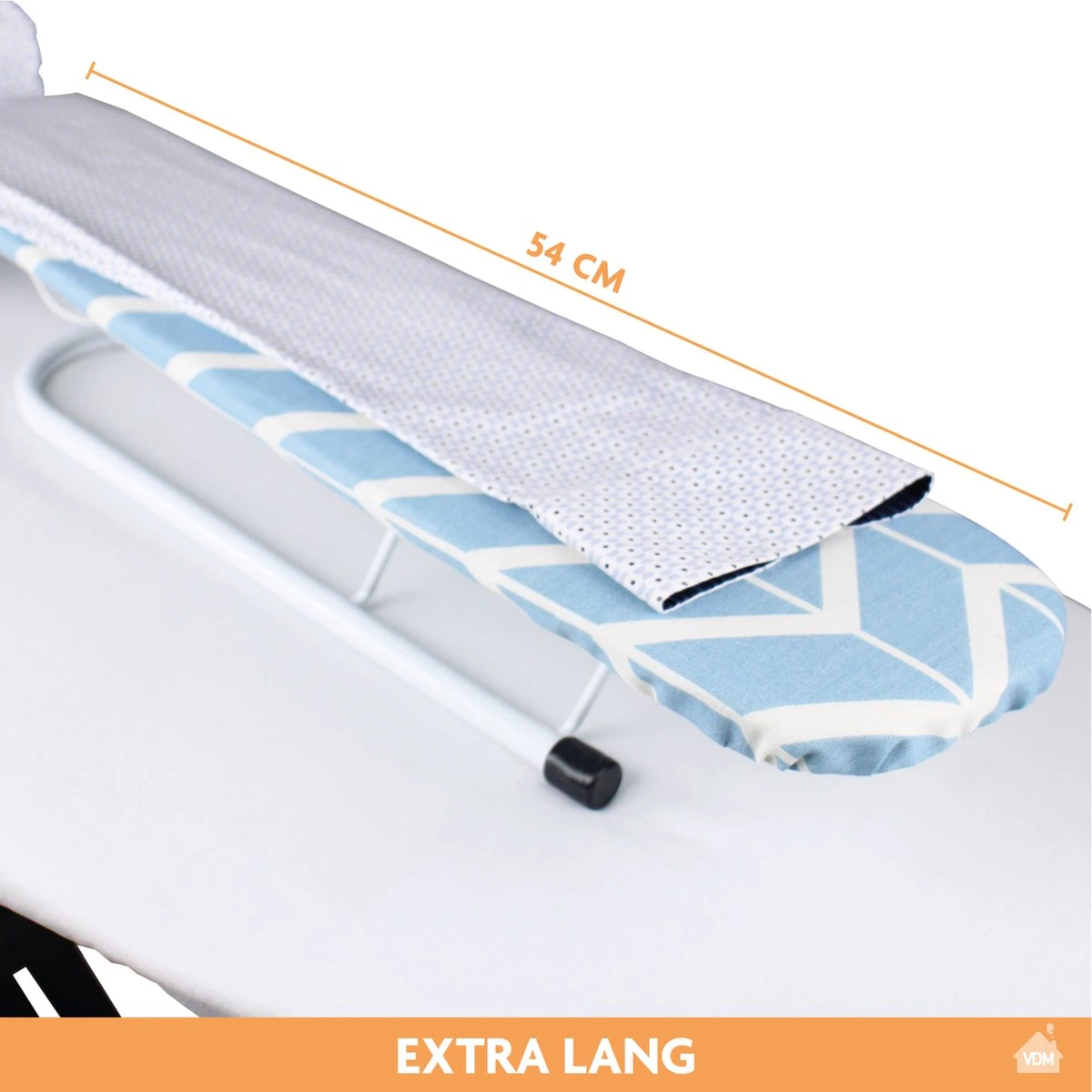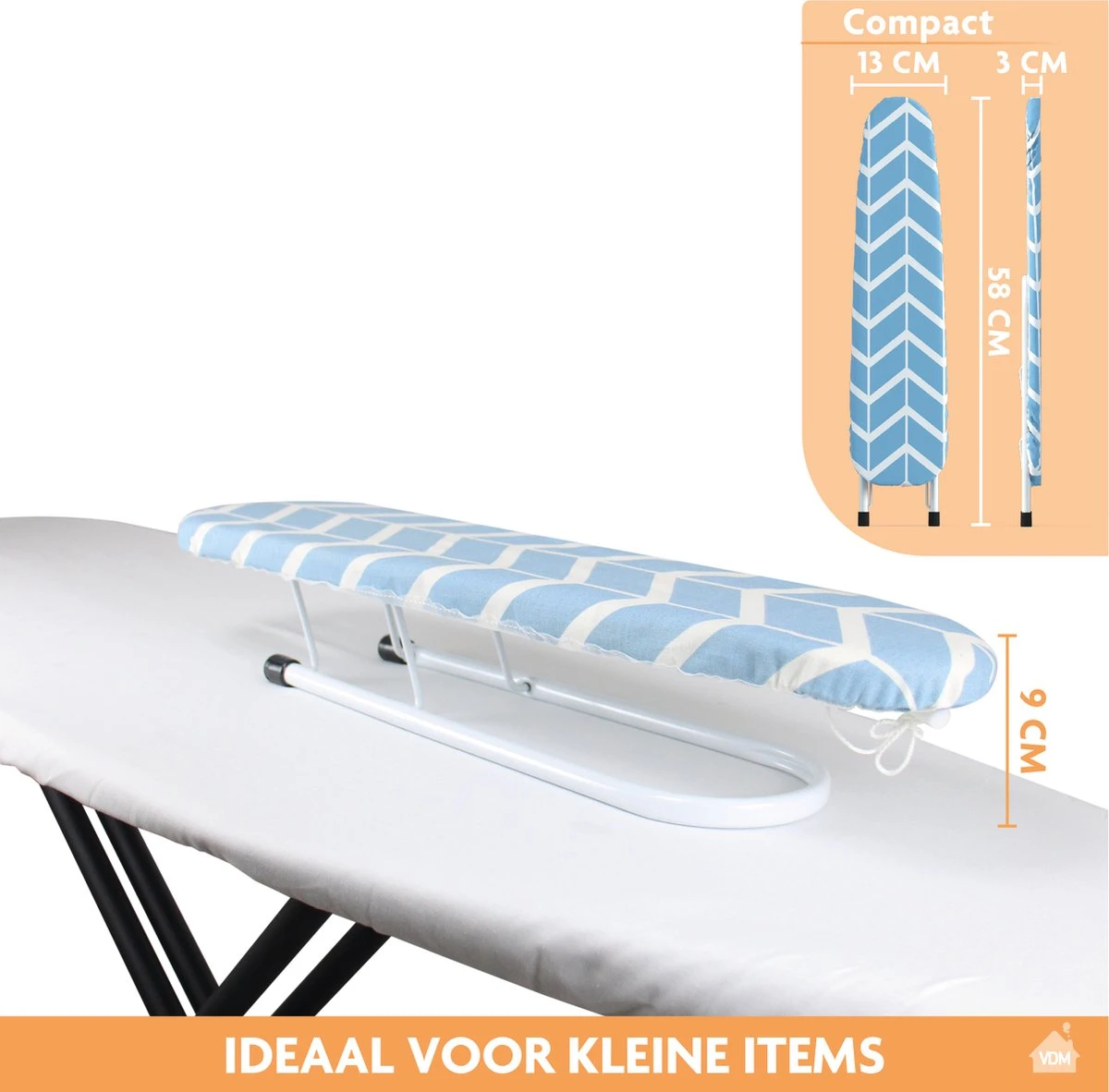 De compacte en stabiele ministrijkplank maakt het extra makkelijk om mouwen, broekspijpen en andere kleine kledingstukken te strijken. Ideaal als je alleen maar kleine dingen moet strijken! Je kunt de mouwstrijkplank eenvoudig combineren met een standaard strijkplank. Deze ministrijkplank heeft een strijkoppervlak van: 54×13 cm. Zet het plankje op jouw strijkplank en laat de hemden maar komen!