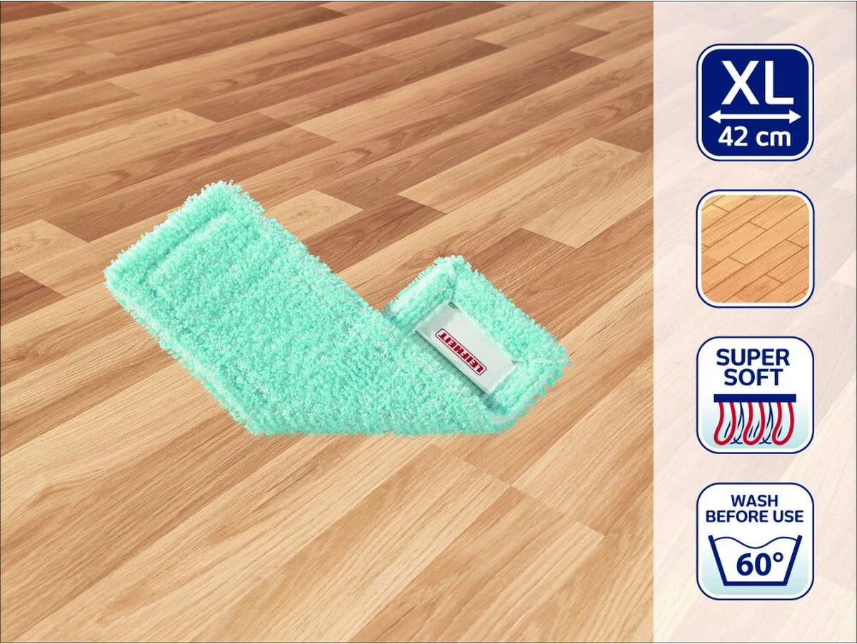 De Profi Extra Soft Overtrek van Leifheit is bijzonder geschikt voor kurk- laminaat- en parketvloeren. De speciale vezels van de doek nemen een minimum aan waterhoeveelheid op en beschermt door de slingerbeweging van de wisser uw kwetsbare vloeren. Hij is wasbaar tot 60°C en verliest ook na herhaaldelijk wassen niet aan reinigingskracht. Past perfect op de vloerwisser Profi (42 cm) van Leifheit.