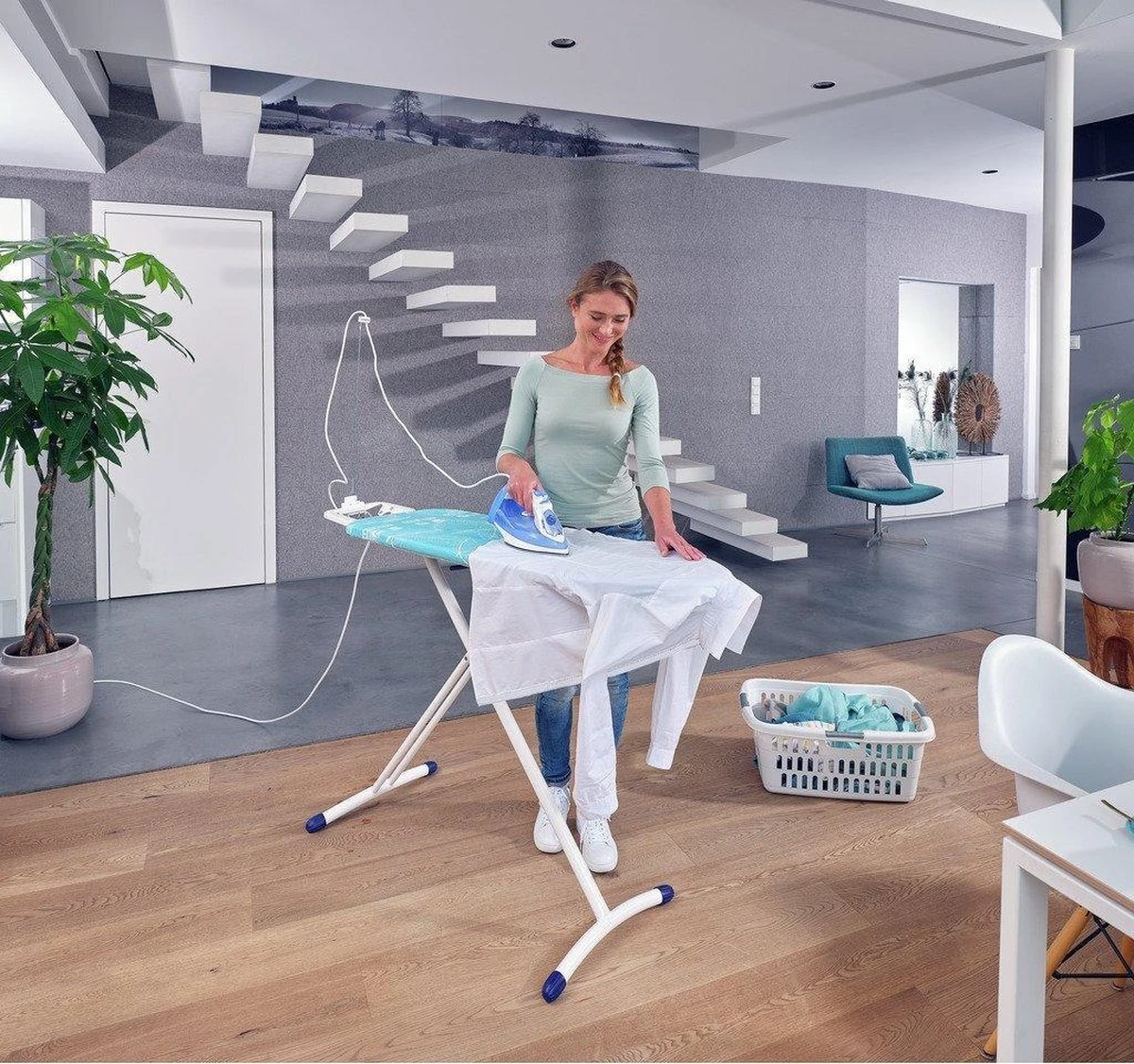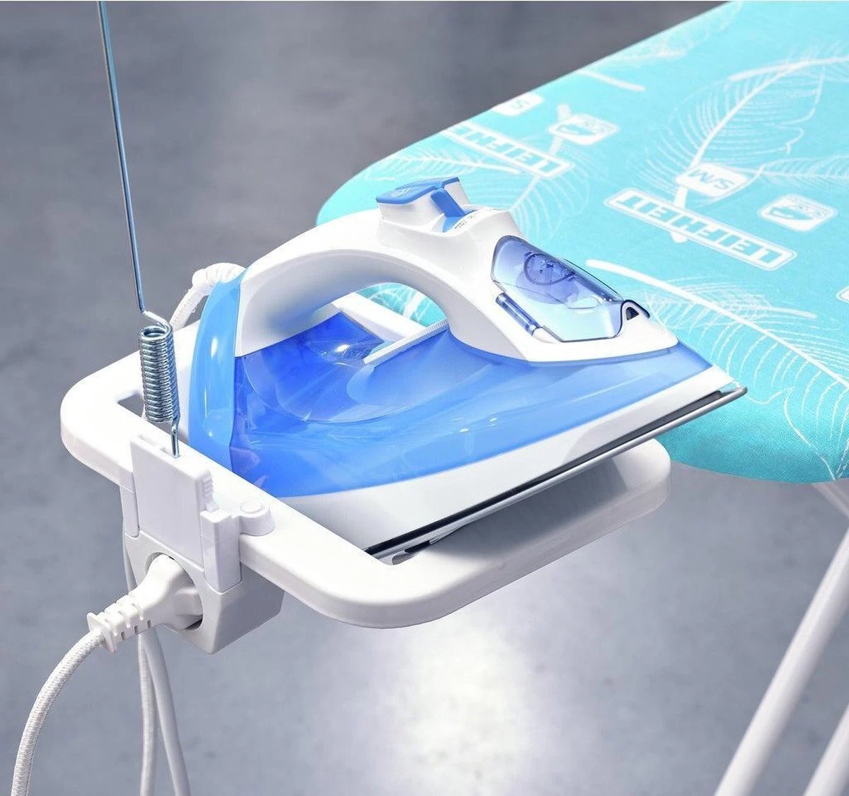 - Vaste strijkijzerhouder met stopcontact en snoergeleider voor stabiel en veilig neerzetten van het strijkijzer.