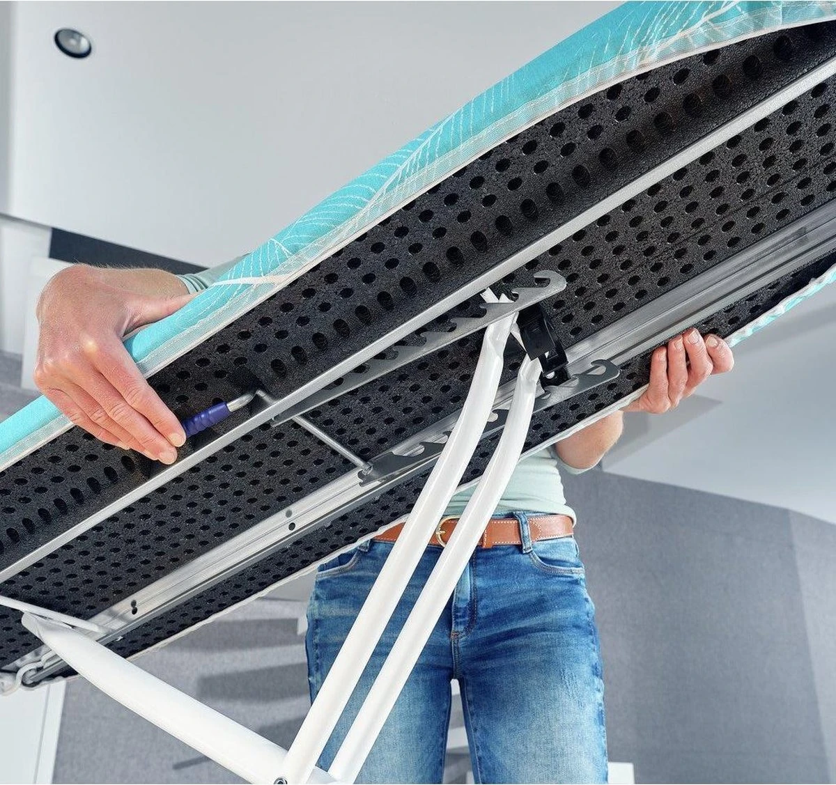 De strijkplank staat absoluut stevig en stabiel. Het strijkvlak van de Air Board M Solid Plus strijkt bovendien méé. Het speciale overtrek met thermo-reflecttechnologie reflecteert de stoom en de hitte van het strijkijzer en maakt daar dus slim extra gebruik van. Er ontstaat een dubbelzijdig strijkeffect: de was wordt tegelijkertijd aan de boven- en de onderkant gestreken.