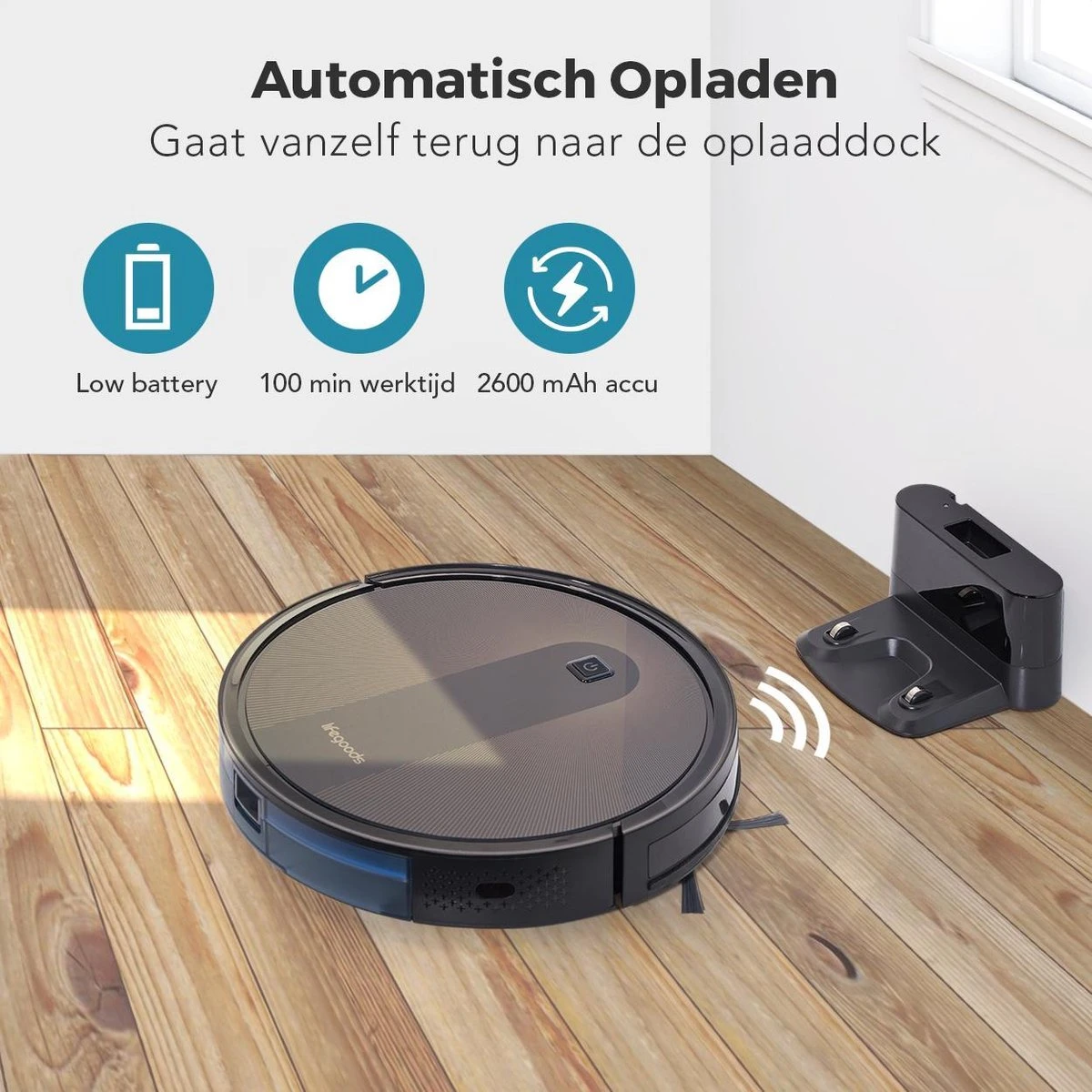 De robotstofzuiger zorgt er zelf voor dat hij altijd opgeladen is. Plug het oplaadstation in een stopcontact en plaats hem op een toegankelijke plek in huis. Via elektronische laadcontacten laadt de robotstofzuiger automatisch op bij het oplaadstation. Zodra de accu bijna leeg is keert de robot automatisch terug naar het oplaadstation.