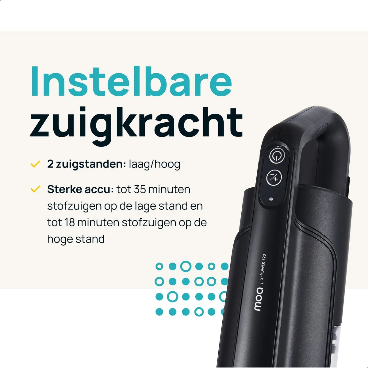 Voor alle snelle en extra stofzuigklusjes is er de MOA Steelstofzuiger. Lichtgewicht en draadloos, maar toch krachtig. Met HEPA 10 luchtfilter en zonder stofzuigerzak. Zo stofzuig je snel de badkamer of slaapkamer zonder onnodig gesjouw en gedoe.
