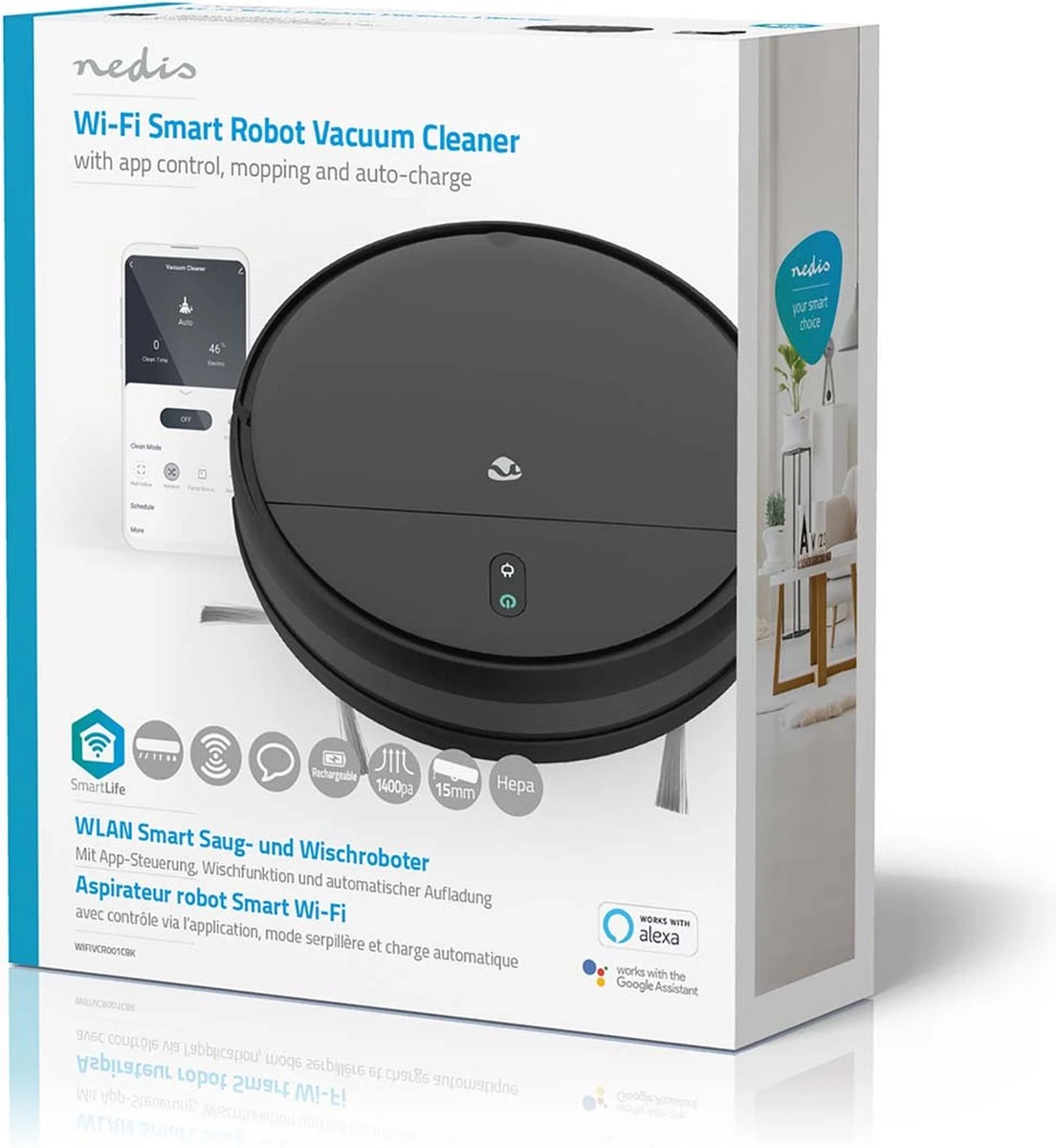 Deze 3-in-1 Smart Wi-Fi-robotstofzuiger kan je huis vegen, stofzuigen en dweilen terwijl jij iets anders doet, of zelfs wanneer je niet thuis bent. Verbind het apparaat met je Wi-Fi thuis en bedien het via de Nedis SmartLife-app (iOS en Android), de afstandsbediening of de knoppen op de robot zelf. Deze robotstofzuiger ondersteunt ook spraakbediening met Alexa en Google Assistant.
