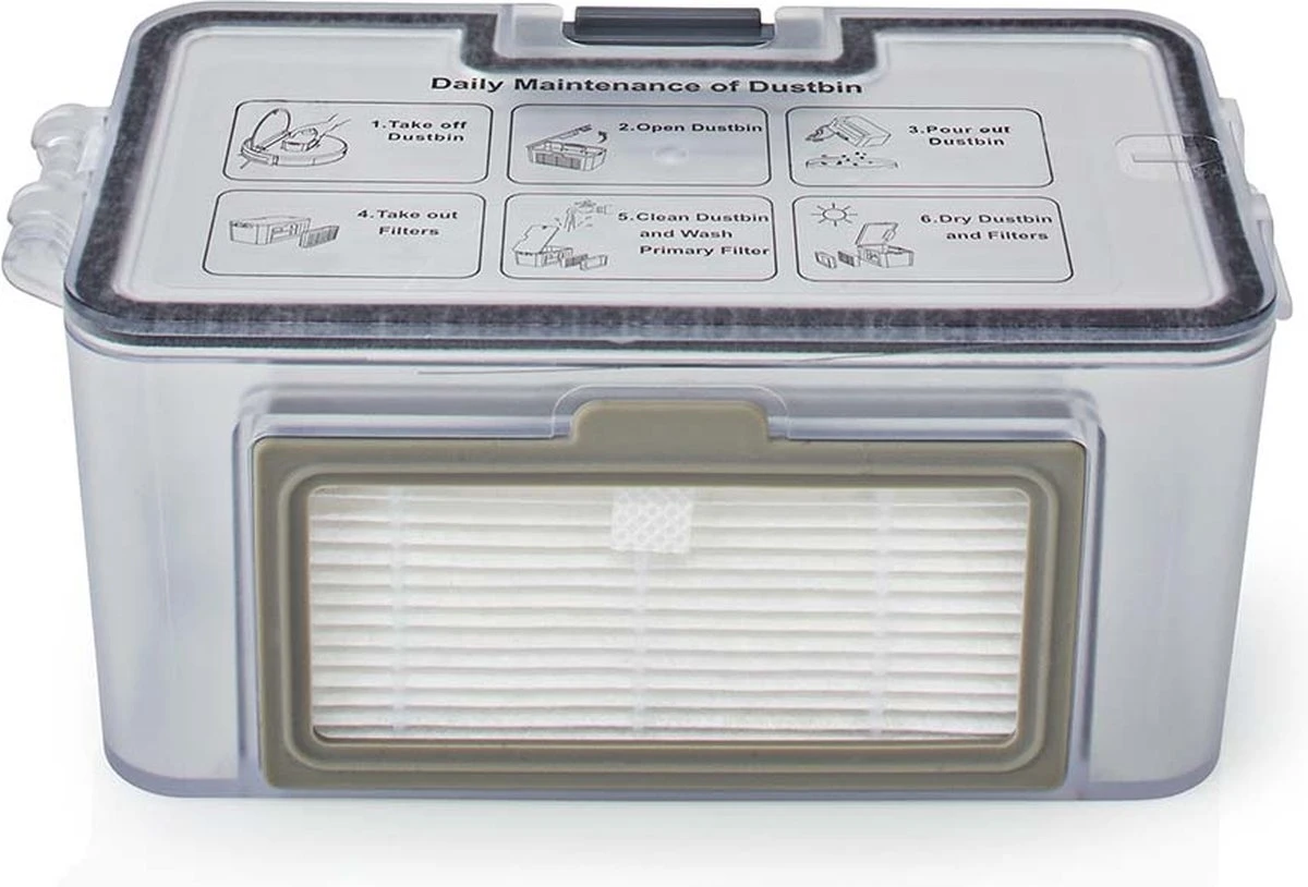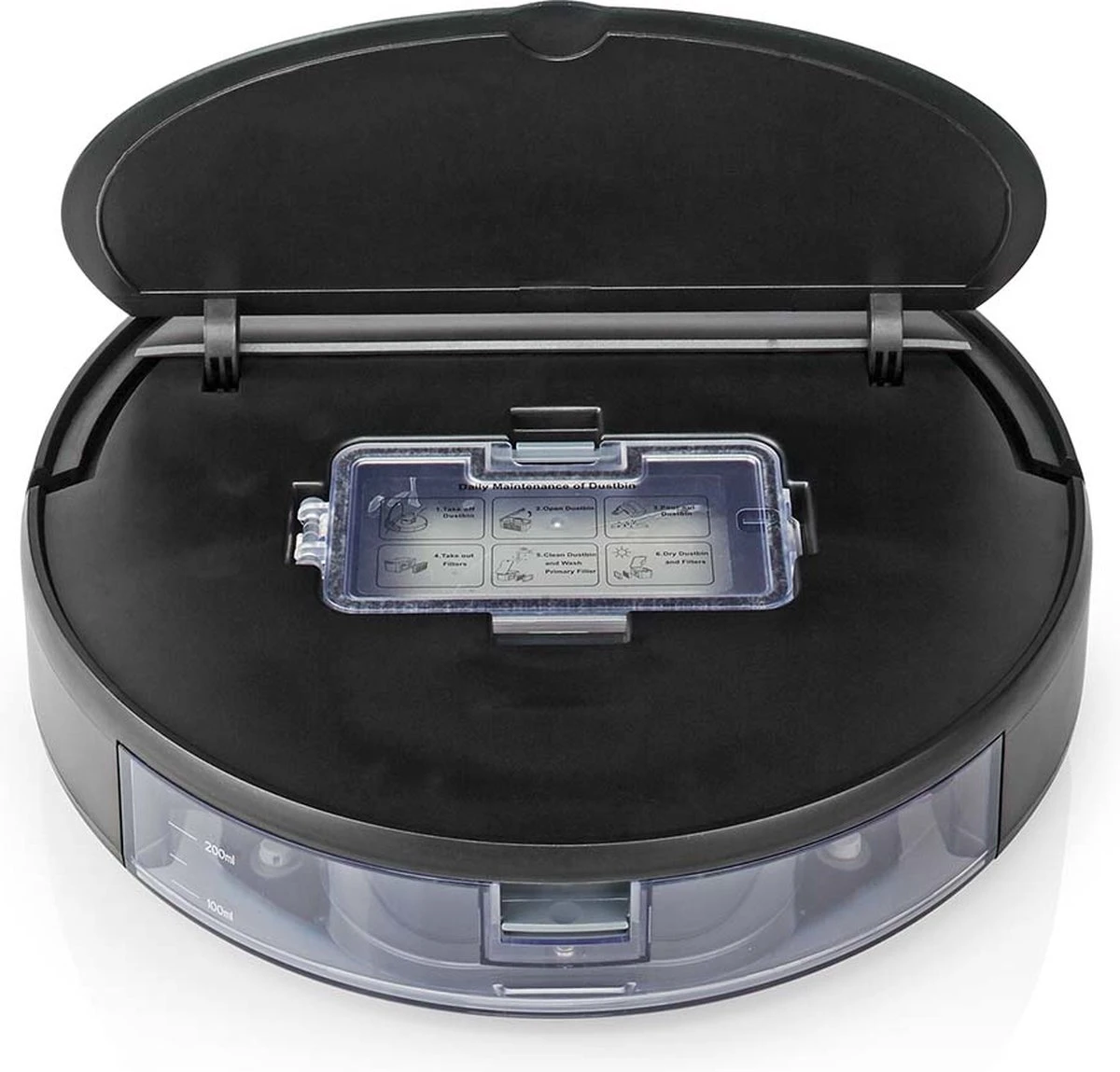 De twee borstels aan de rand vegen langs de muren en andere voorwerpen om stof en vuil te verzamelen en alles naar het midden te leiden waar het wordt opgezogen, dankzij de 1400 Pa sterke borstelloze motor. De sensoren detecteren muren, objecten en trappen of afstapjes om zo botsingen en vallen te voorkomen. Als hij klaar is, of als de batterij leeg raakt, gaat hij automatisch terug naar de oplader om zichzelf op te laden, zodat hij altijd klaar is voor de volgende taak. De robotreiniger heeft een HEPA-filter dat alle fijne deeltjes uit de lucht verwijdert, wat betekent dat je minder last hebt van allergieën. De krachtige lithium-ionbatterij betekent dat de robotreiniger 90 minuten ononderbroken kan werken en snel weer is opgeladen.