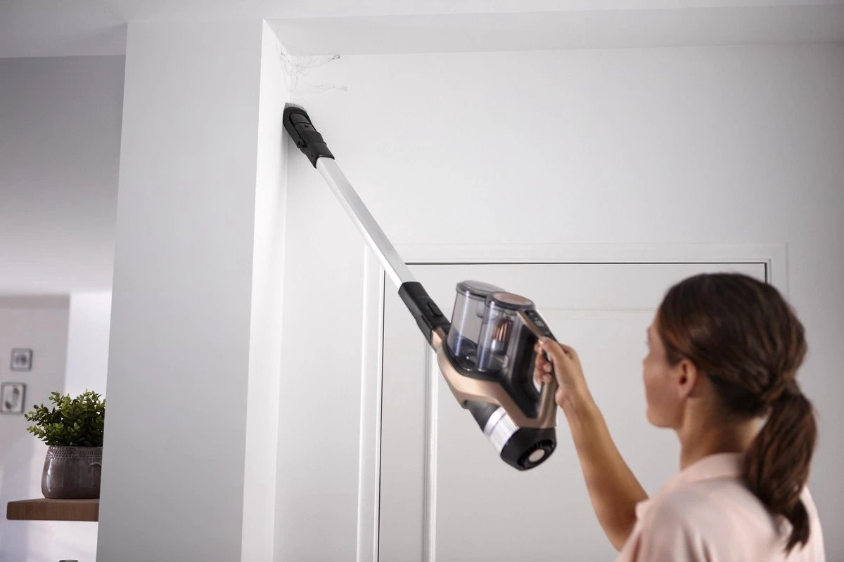 Wanneer de accu van de steelstofzuiger boven op de steelstofzuiger zit, kun je makkelijk onder meubels stofzuigen en is de steelstofzuiger licht genoeg om op te tillen om het plafond te kunnen zuigen. Echter, de steelstofzuiger is nu zwaarder voor normaal gebruik op de vloer. Het gewicht van deze stofzuiger is 2,73 kg.