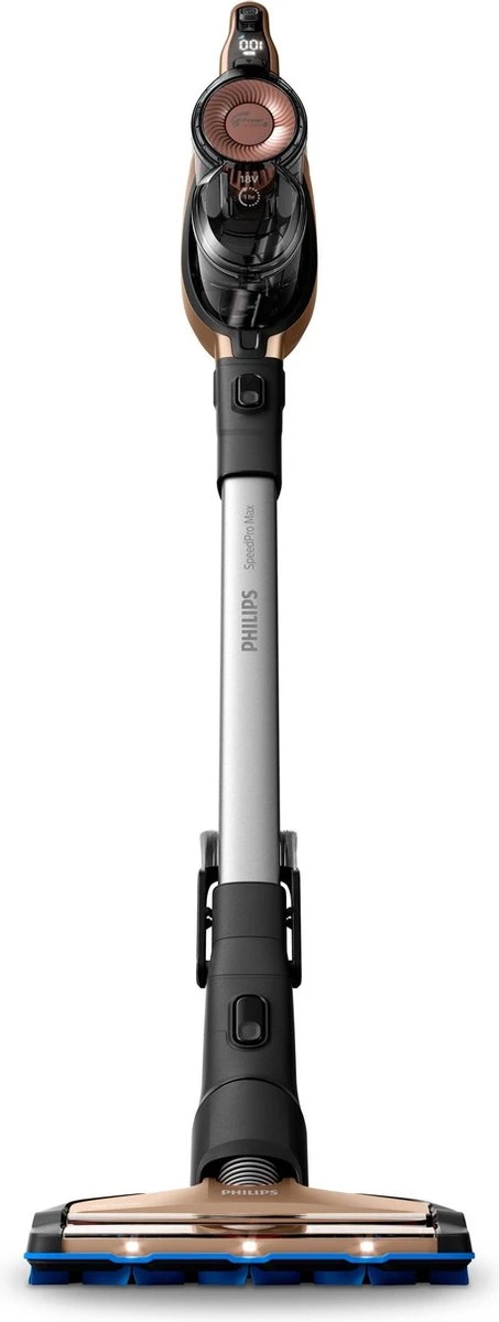 Met SpeedPro Max haalt je de snelste manier van snoerloos schoonmaken in huis. Met een volle accu en door de krachtige PowerBlade-motor stofzuig je tot 65 minuten aan 1 stuk door. De zuigmond heeft twee unieke eigenschappen: 1 . Met iedere beweging neemt het 360 graden mondstuk stof en vuil op, zelfs achterwaarts en in hoeken. Dit unieke 360 graden mondstuk is geschikt voor alle typen vloeren, zodat wisselen niet nodig is. 2. Op het mondstuk zit led verlichting waardoor het zuigen op donkeren plekken makkelijker wordt. Gebruik de geïntegreerde borstel op de steel voor nauwe kieren en moeilijk bereikbare plaatsen.