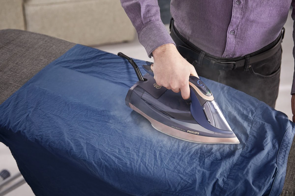 De Azur 8000-serie levert tot 85 g/min extra krachtige en consistente stoomproductie om kreuken sneller te verwijderen. - SteamGlide Elite-zoolplaat