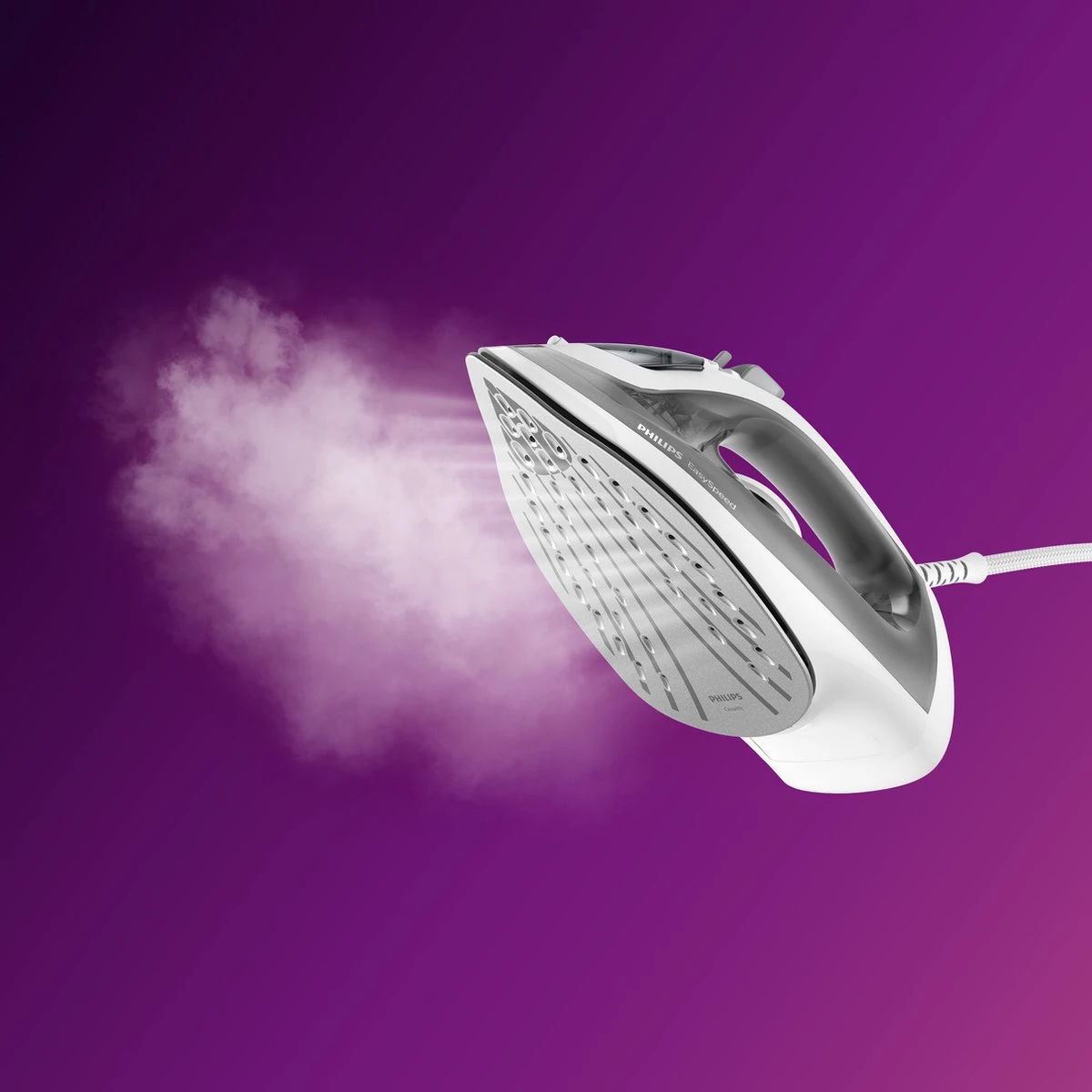 Met het EasySpeed-strijkijzer strijkt u nog gemakkelijker en effectiever. Het strijkijzer produceert een grote hoeveelheid stoom waarmee hardnekkige kreukels worden verwijderd, heeft een keramische zoolplaat zodat het makkelijk over alle stoffen glijdt, is krasbestendig en een Calc Clean-functie voor langdurig goede prestaties.