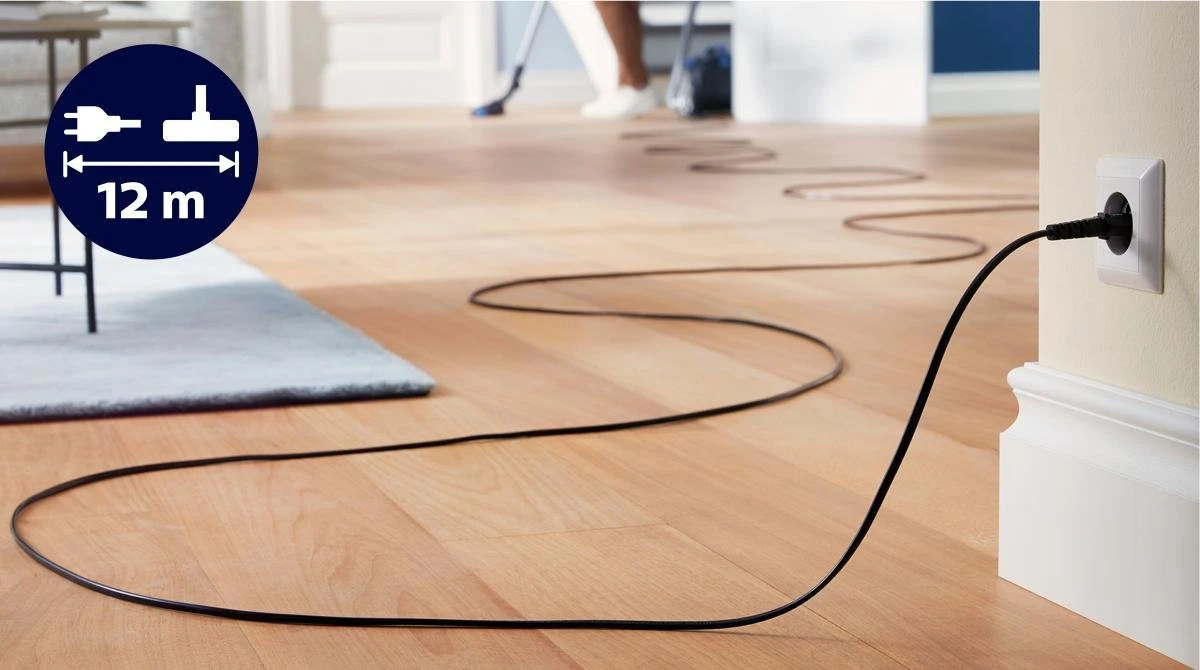 Met een bereik van 12 meter van stekker tot mondstuk kun je langer schoonmaken zonder loskoppelen.
