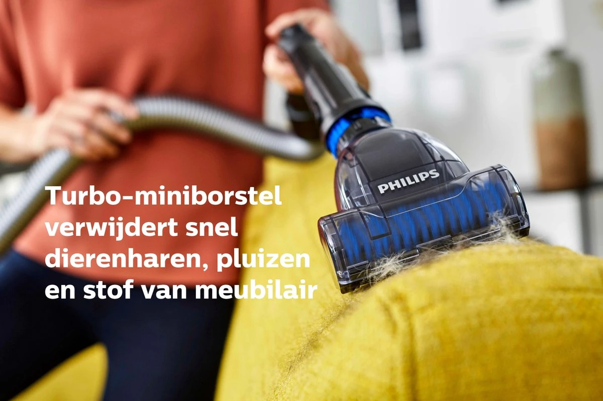 Inclusief Parketmondstuk én Turbo-miniborstel verwijdert snel (dieren)haren, pluizen en stof van meubilair