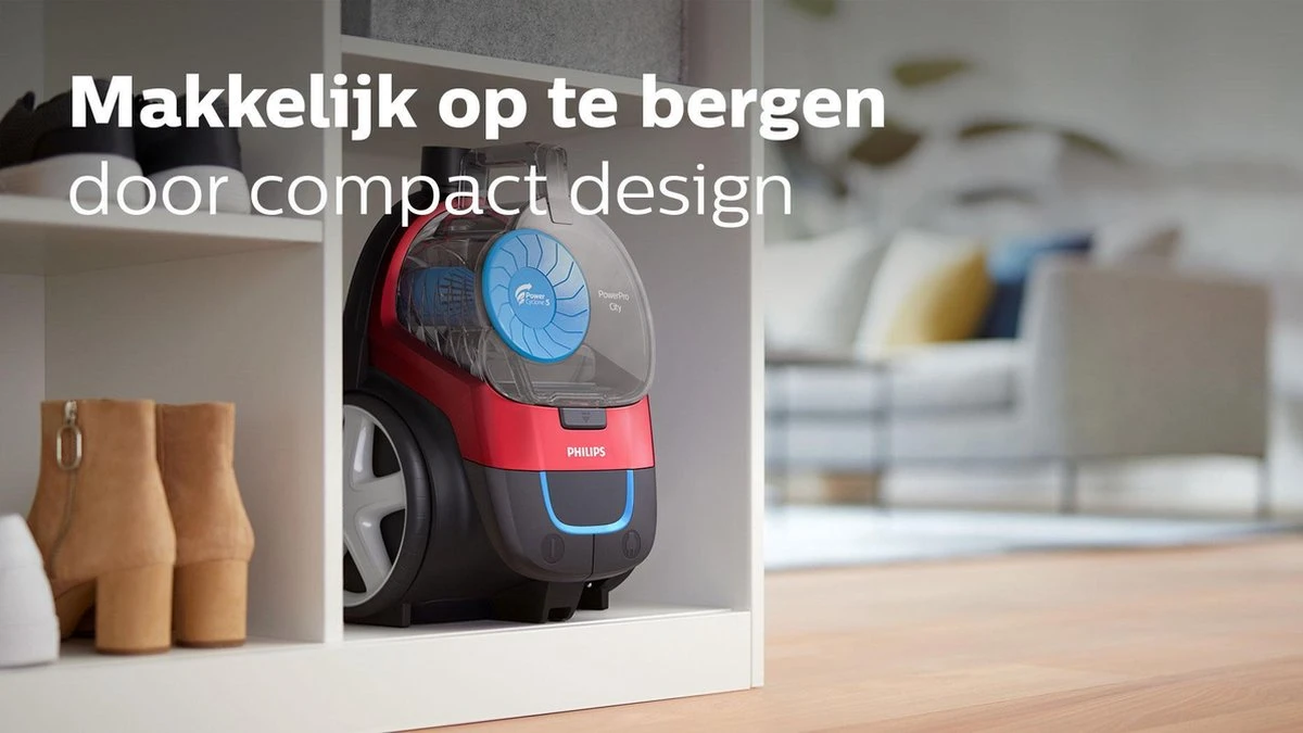 Het compacte en lichte design zorgt ervoor dat de stofzuiger eenvoudig kan worden opgeborgen en gedragen.