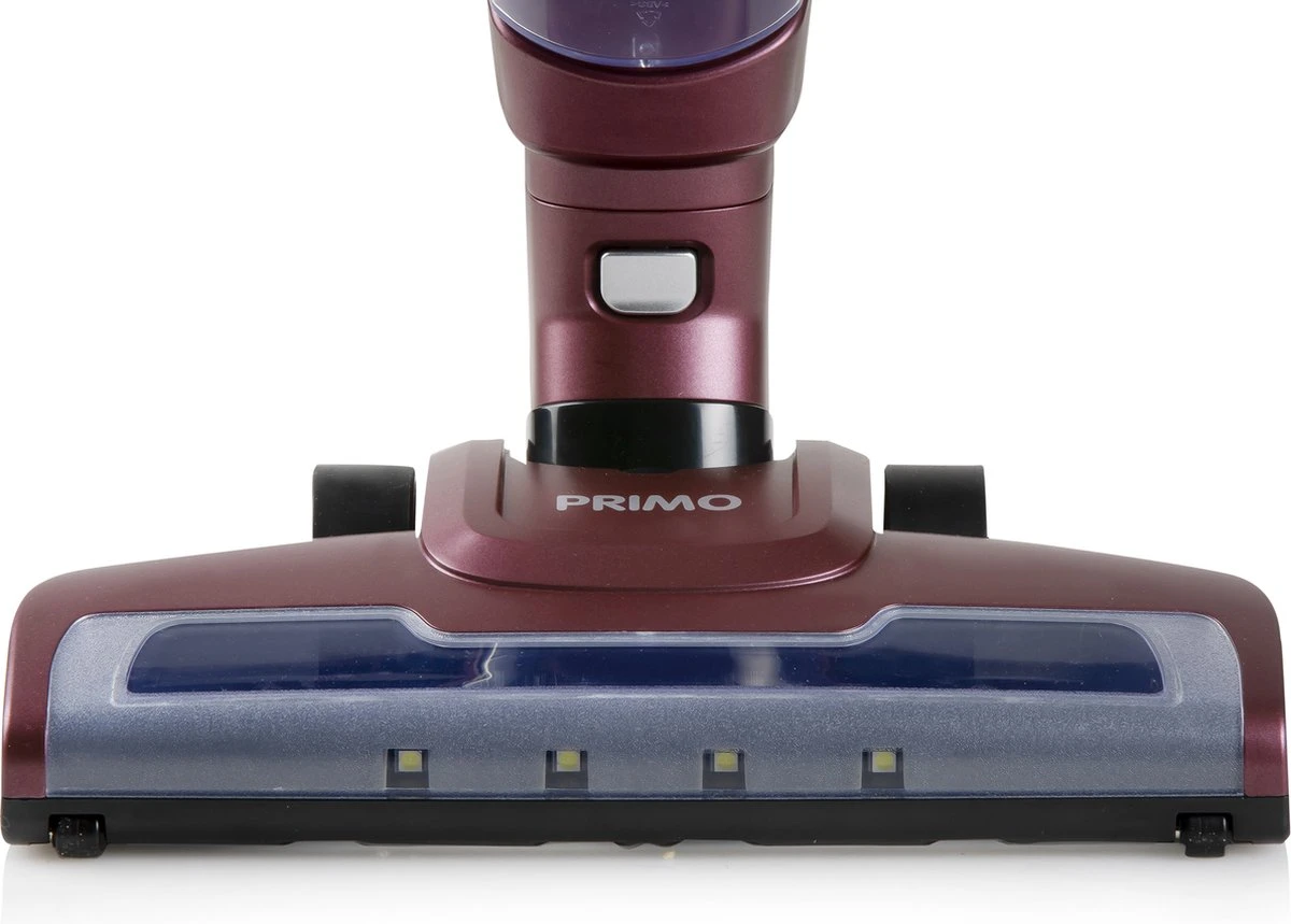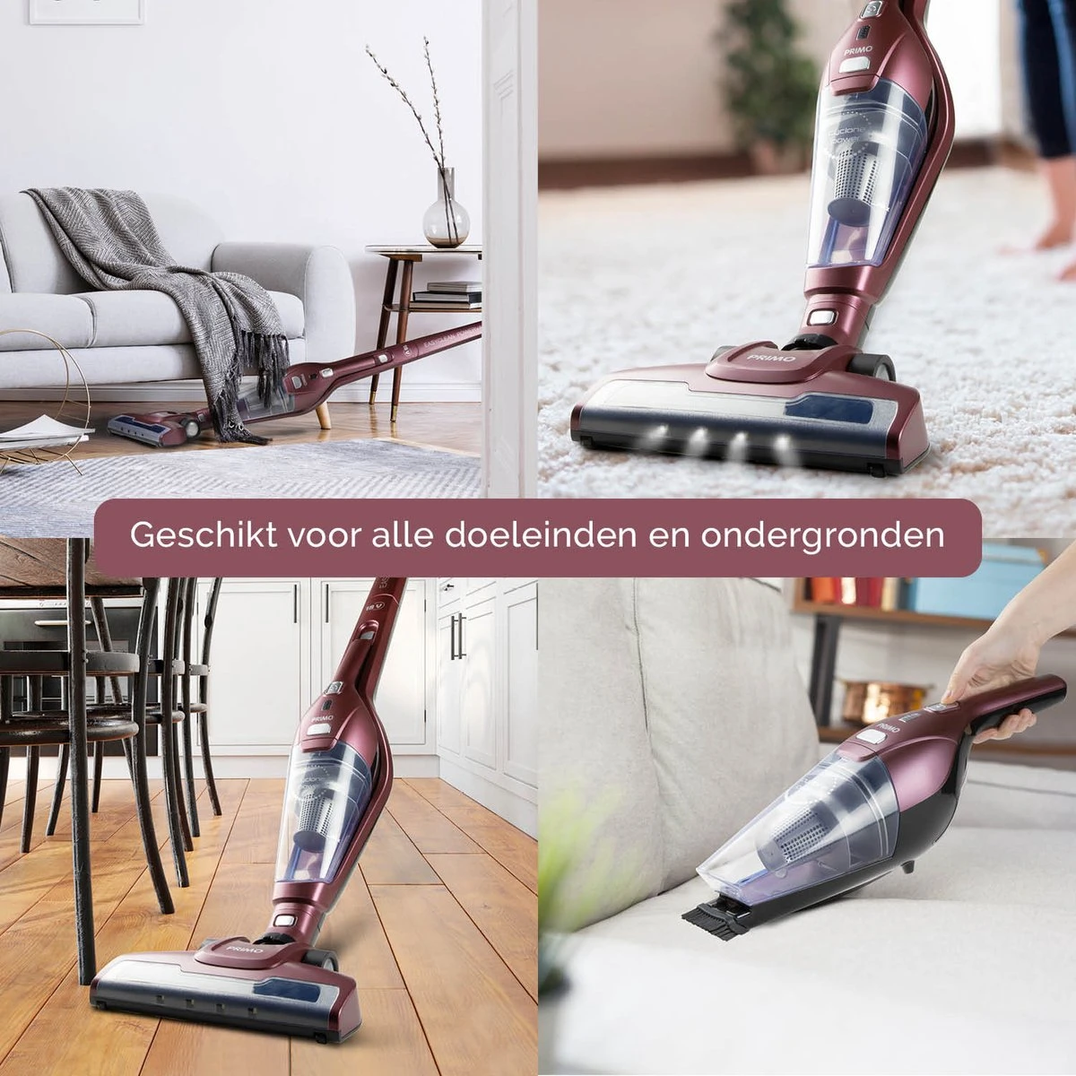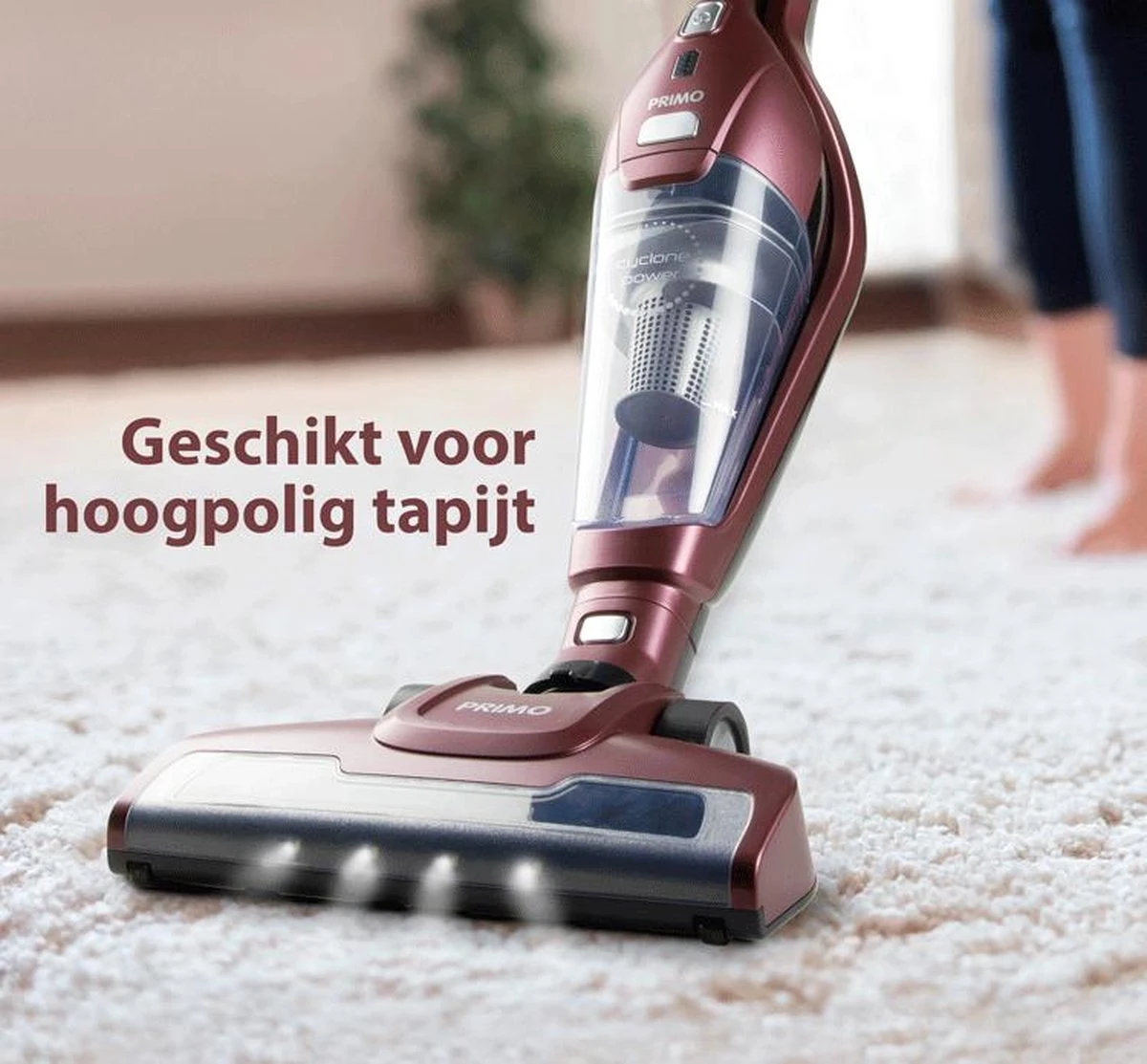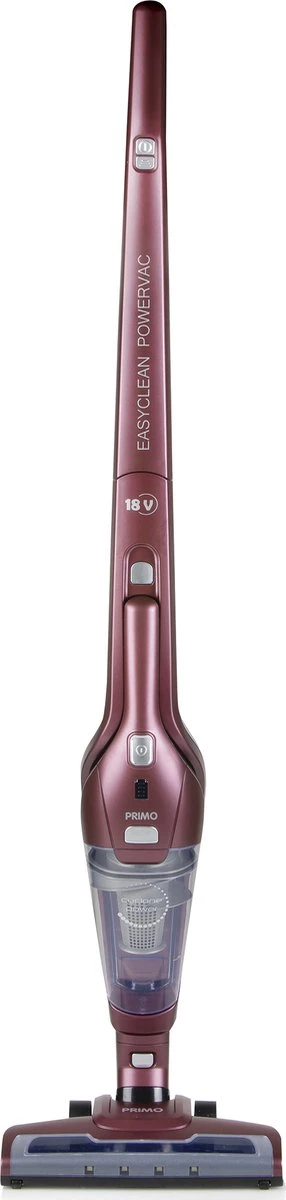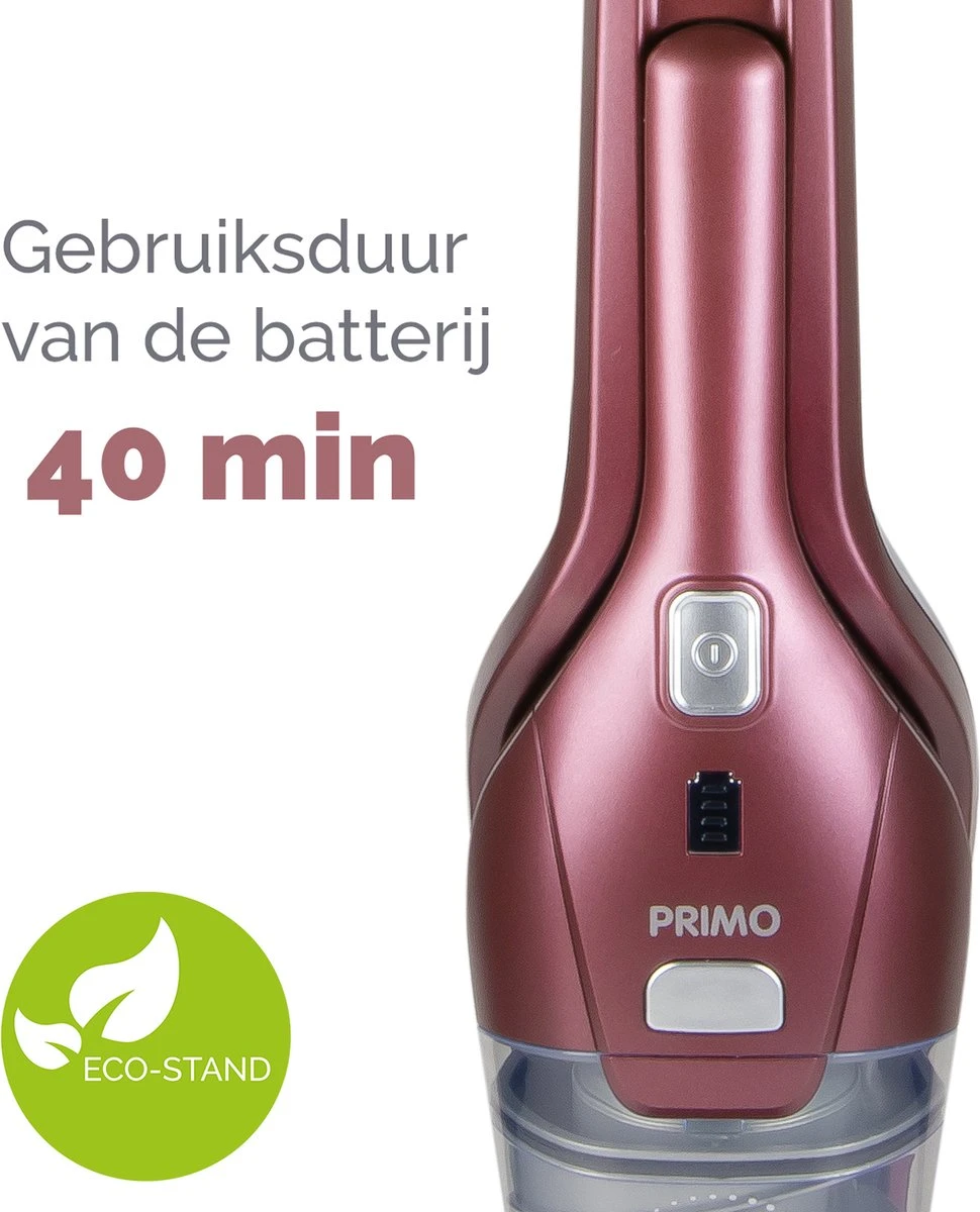 De PRIMO PR508SV 2-in-1 steelstofzuiger zonder zak / kruimelzuiger is je ideale hulpje om snel wat op te zuigen. Zo blijft je vloer schoon zonder direct de grote bedrade stofzuiger te moeten pakken. Ook heeft de PR508SV een flexibele borstelkop om gemakkelijk in ieder hoekje of onder banken te komen. De krachtige 18 V Lithium-Ion accu geeft je maar liefst 40 minuten kracht op de ECO stand als kruimelzuiger. Is de zuigwerk toch hardnekkiger dan schakel je over naar de TURBO stand met 20 minuten zuigkracht via de borstelkop. De Flexibele borstelkop met LED-verlichting is geschikt voor alle vloertypen. Doordat de PR508SV Steelstofzuiger draadloos is, heb je complete bewegingsvrijheid. Als je de steel verwijderd verander je de Handstofzuiger in een kruimelzuiger. De PR508SV komt in de kleur Bordeaux Rood.