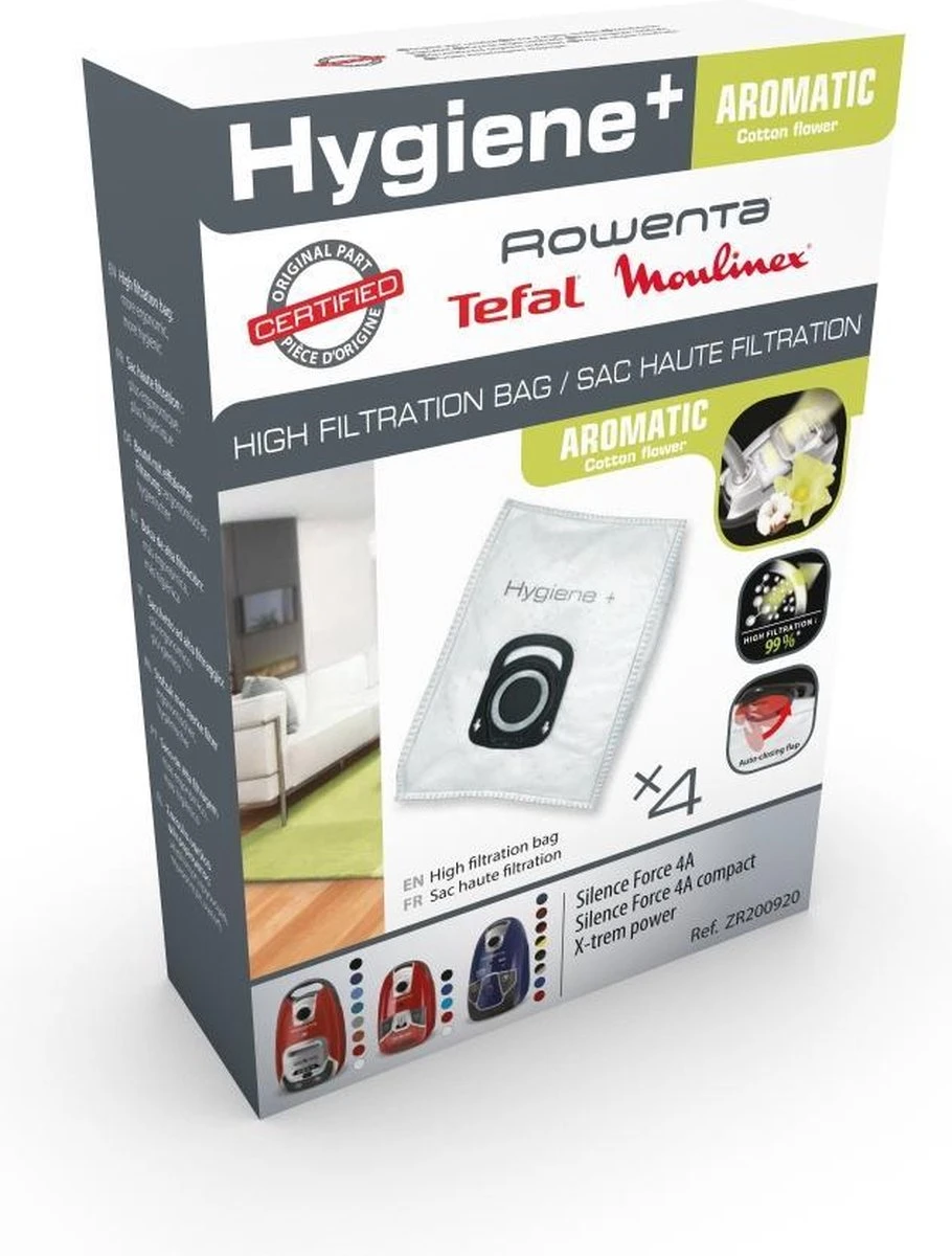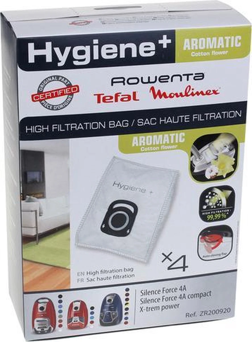 Dankzij deze Rowenta ZR2009 Cotton Flower stofzuigerzakken wordt 99,99% van het stof gefilterd. Dit zorgt voor een extra hygiënische reiniging. Er zitten 4 stofzuigerzakken in deze verpakking. De stofzuigerzakken zijn geschikt voor de gehele Silence Force range, maar kunnen ook in de Compact Power en X-Trem Power stofzuigers van Rowenta. Zie hieronder een lijst met voorbeelden: