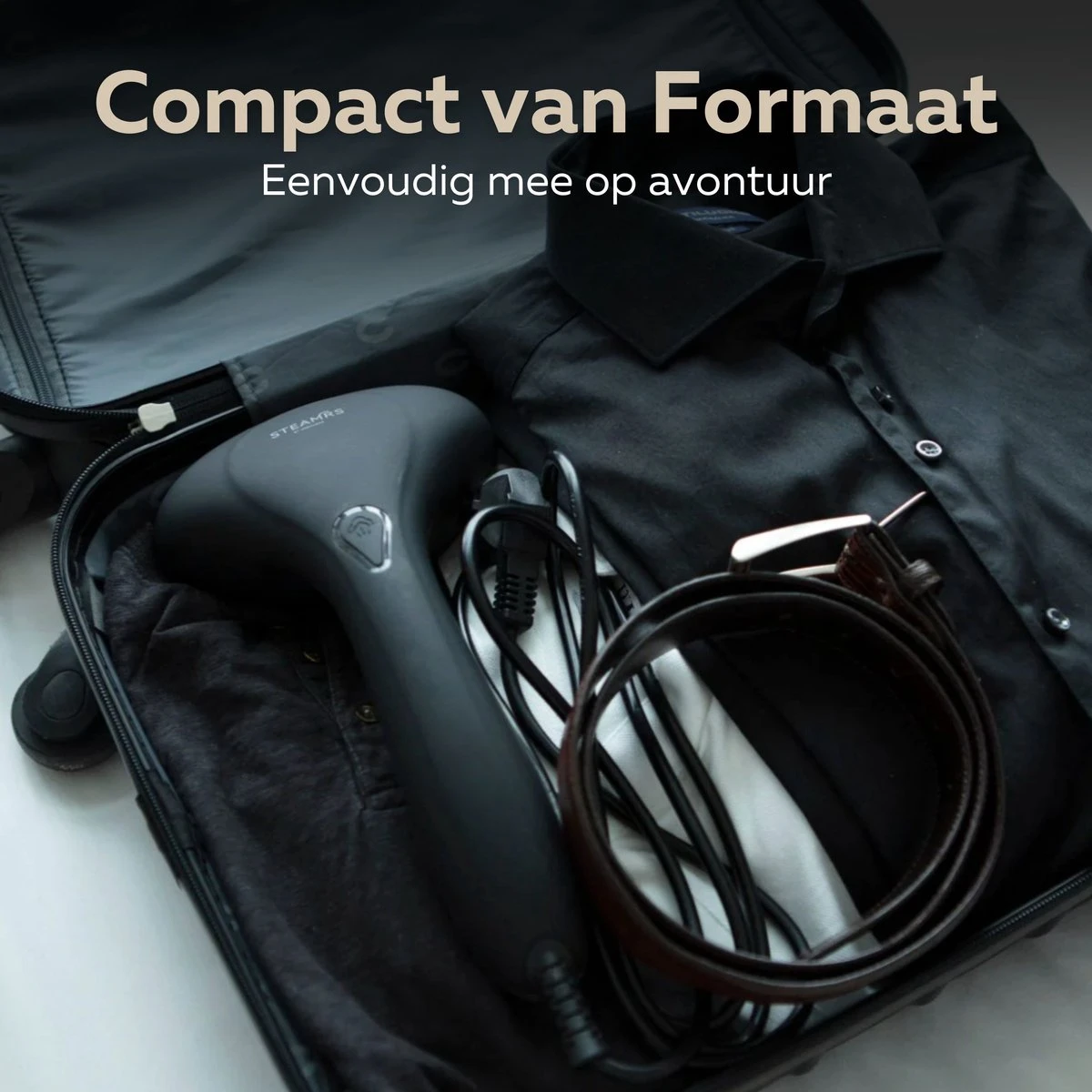 De luxe STEAM’R kledingstomer is compact van formaat (33x15x10 cm) en weegt net iets meer dan 500 gram. Hiermee is hij niet veel zwaarder dan een föhn. De handstomer ligt, zoals de naam al weggeeft, goed in de hand en is makkelijk te bedienen. Het voelt stevig en luxe aan. Door het compacte formaat is het ideaal om de kledingstomer mee te nemen op reis en hij is gemakkelijk op te bergen in een la. - Automatisch continue stoom voor eenvoudig ontkreuken