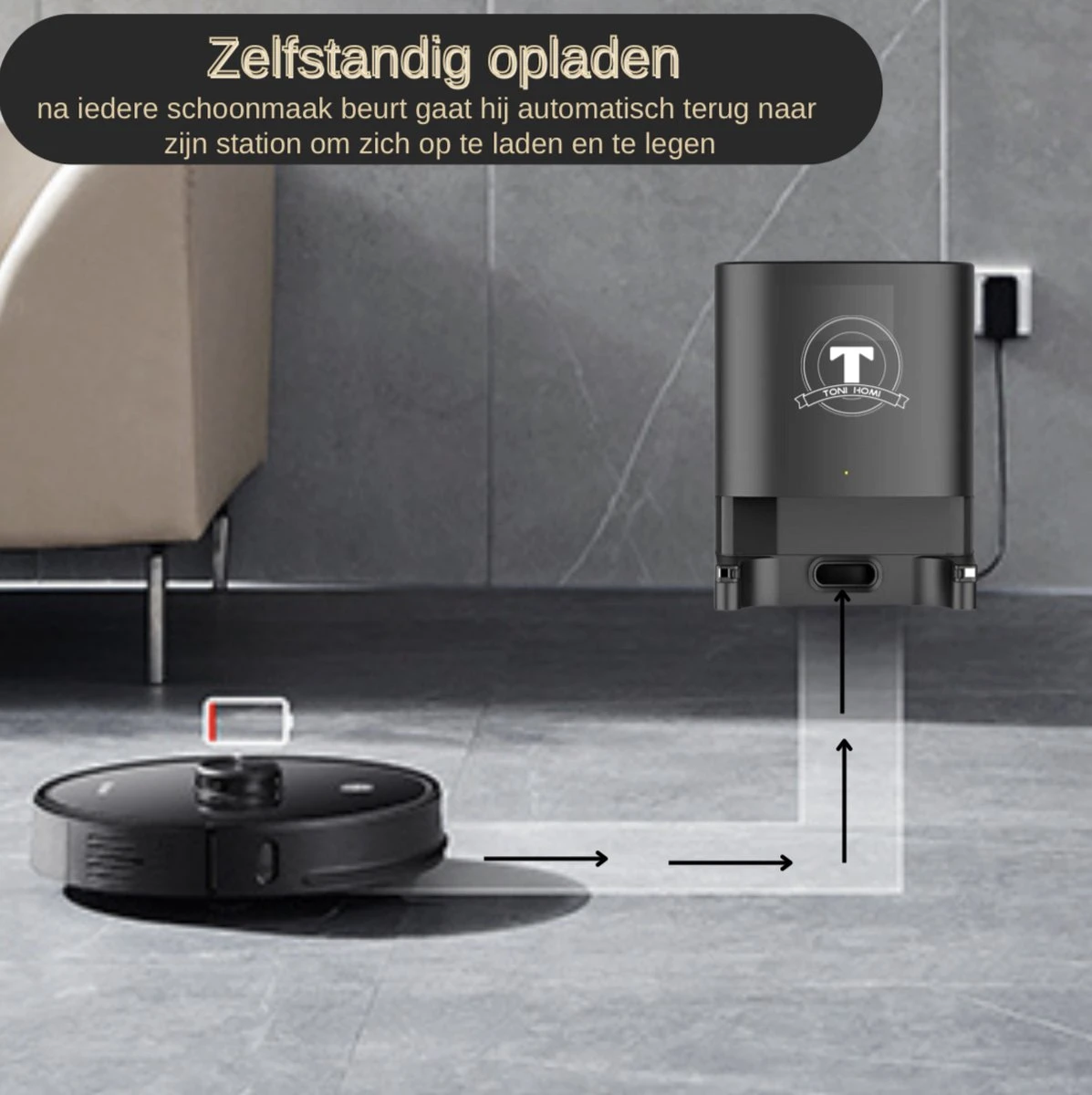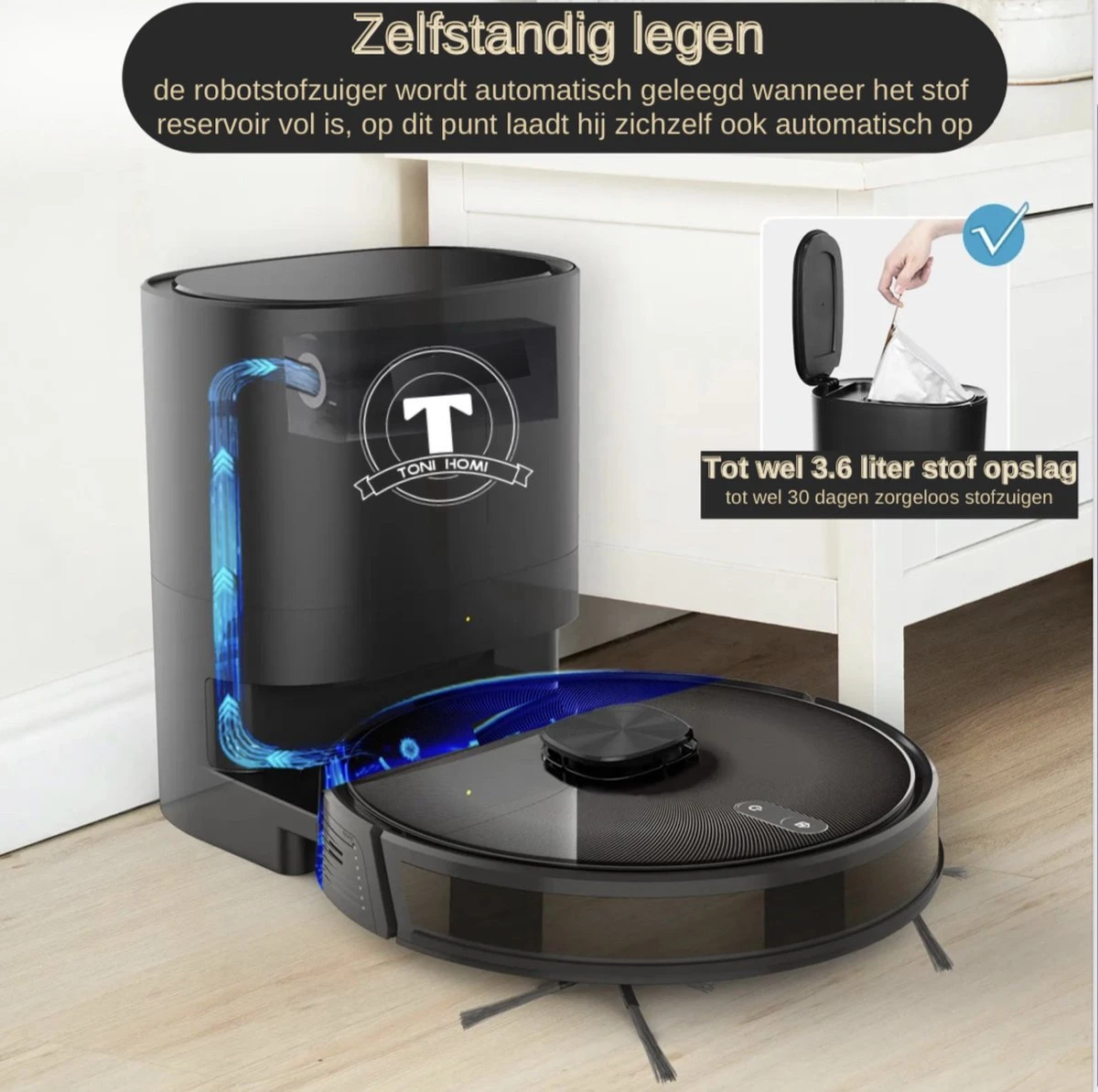 – Door de afzuigfunctie op het leeg/laadstation hoeft u niet na iedere schoonmaakbeurt het stofreservoir leeg te maken die in de robotstofzuiger zelf zit. Zo hoef jij meerdere weken niet om te kijken naar het stofzuigen.
