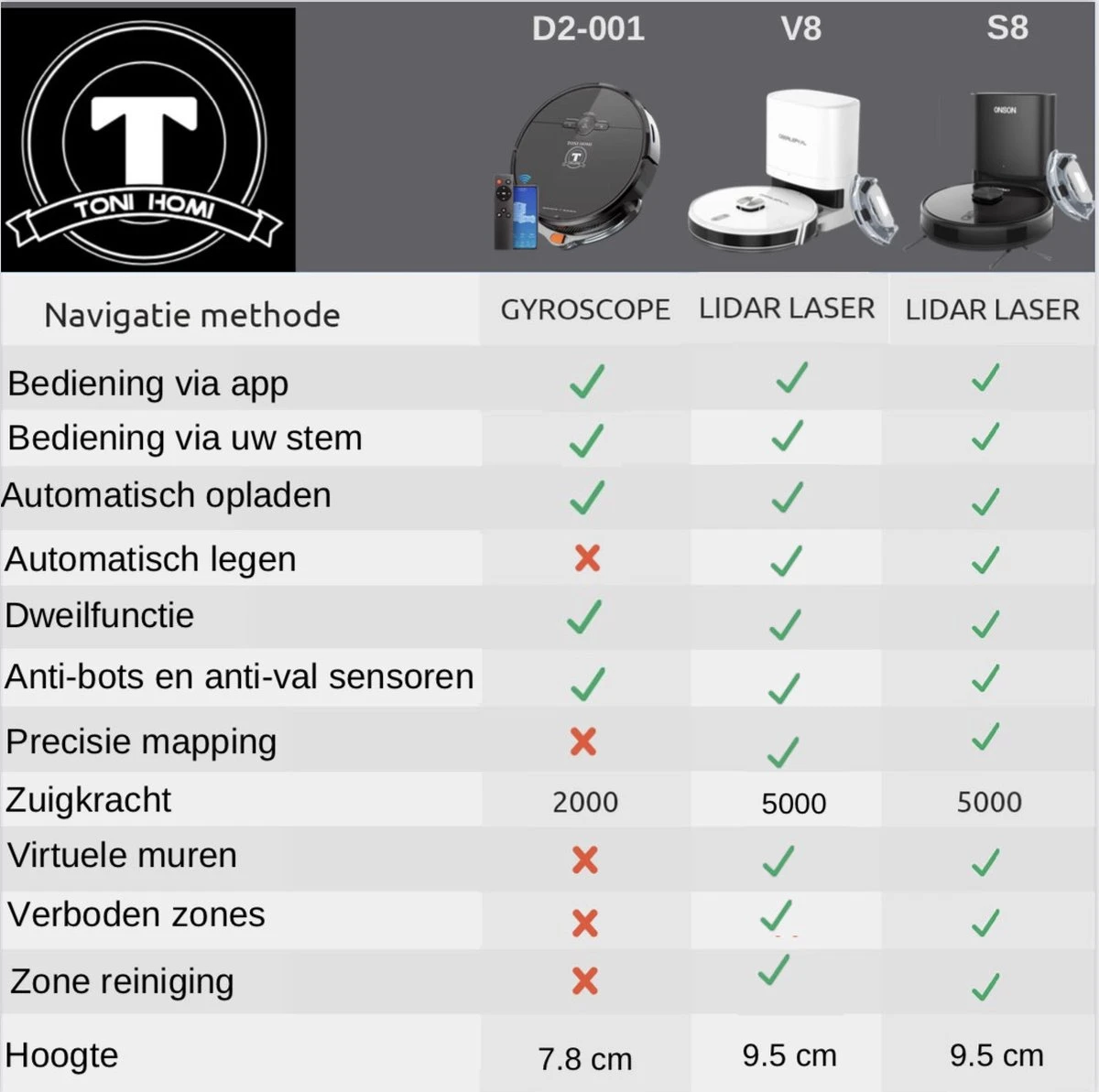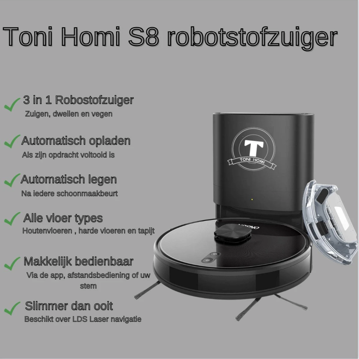 De TONIHOMi S8 robotstofzuiger met dweilfunctie behoort met zijn innovatieve functies tot de beste robotstofzuigers van 2023. De S8 beschikt over een slimme 360° Laser-Radar met LDS én SLAM technologie. Uw woonkamer of een dergelijke ruimte zal de S8 robotstofzuiger in zijn geheel scannen wat u vervolgens terug kunt zien in de app op uw telefoon. Zo kunt u ten aller tijden zien waar de robotstofzuiger zich bevindt of dat nou bij zijn station is of in beweging u houdt altijd het overzicht in de app. In de app kunt u de robotstofzuiger ook gemakkelijk verder instellen. Zo kunt u een schoonmaakprogramma aanmaken, waarbij u de schoonmaak dagen aangeeft en de gewenste tijd van die dag. Als u plekken heeft waar de robotstofzuiger niet mag zuigen of dweilen kunt u gemakkelijk in de gescande kaart in uw app verboden gebieden aangeven zodat de robotstofzuiger dat aangegeven gebied vermijd. Met de 5000 PA sterke zuigkracht zuigt de S8 gemakkelijk borrelnoten, broodkruimels en hondenharen op. Met de krachtige ingebouwde motor is niks de robotstofzuiger teveel. Door de ingebouwde geluidsdempers is de stofzuiger vrijwel geruisloos. De robotstofzuiger beschikt over een exclusieve lithium-accu waardoor hij tot wel 240m2 kan stofzuigen of dweilen achter elkaar. Nadat de robotstofzuiger zijn schoonmaakbeurt erop zit zal hij automatisch terugkeren naar zijn station waar hij automatisch wordt leeg gezogen en vervolgens wordt opgeladen voor zijn volgende schoonmaakbeurt.
